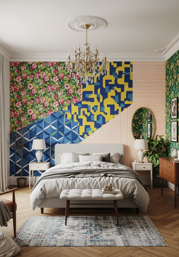 For a truly dynamic and eclectic focal point, create a patterned feature wall collage behind your bed. Instead of a single wallpaper, use several different, bold wallpapers with diverse patterns—think a large floral, a geometric print, and a subtle stripe—all unified by a common color palette. Cut these wallpapers into large, irregular shapes and arrange them in an overlapping, artistic collage. This creates a visually stunning and unique backdrop that celebrates pattern and color. Pair this with a simple, upholstered bed and minimalist furniture to let the wall be the star, showcasing your bold eclectic style.