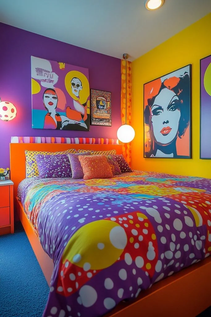 Retro Pop Art decor infuses the colorful eclectic bedroom with elements of popular culture and graphic design reminiscent of the 1950s and 60s. This style is characterized by vibrant colors, bold prints, and nostalgic references that create a fun and upbeat environment. It’s perfect for those who appreciate vintage styles but want a modern twist. Furniture often includes mid-century modern pieces that complement the vivid pop art pieces, creating a lively and unique space.