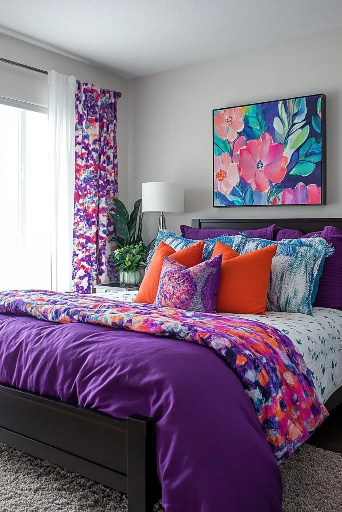 Artistic Color Splash involves incorporating bold, vibrant strokes of color in a seemingly random yet strategically planned way that mimics an artist’s palette. This approach turns the colorful eclectic bedroom into a dynamic canvas, where each piece of furniture and decor contributes to a visual explosion of style. It’s ideal for those who love vibrant colors and want a space that reflects creativity and boldness. The mix of modern art and colorful, eclectic decor keeps the bedroom energetic and visually interesting.