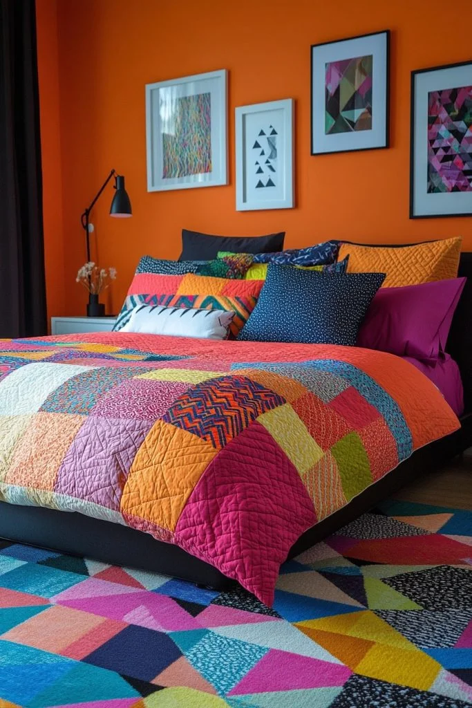 Bold Geometric Color uses sharp lines and block colors to create a striking and modern colorful eclectic bedroom. Incorporating geometric patterns on walls, bedding, or rugs can define the space with a clean, contemporary edge that still feels playful. This style pairs well with minimalist furniture to balance the busyness of the patterns, maintaining a sophisticated but youthful vibe. The use of bold colors helps to segment the room visually, creating distinct areas of interest.