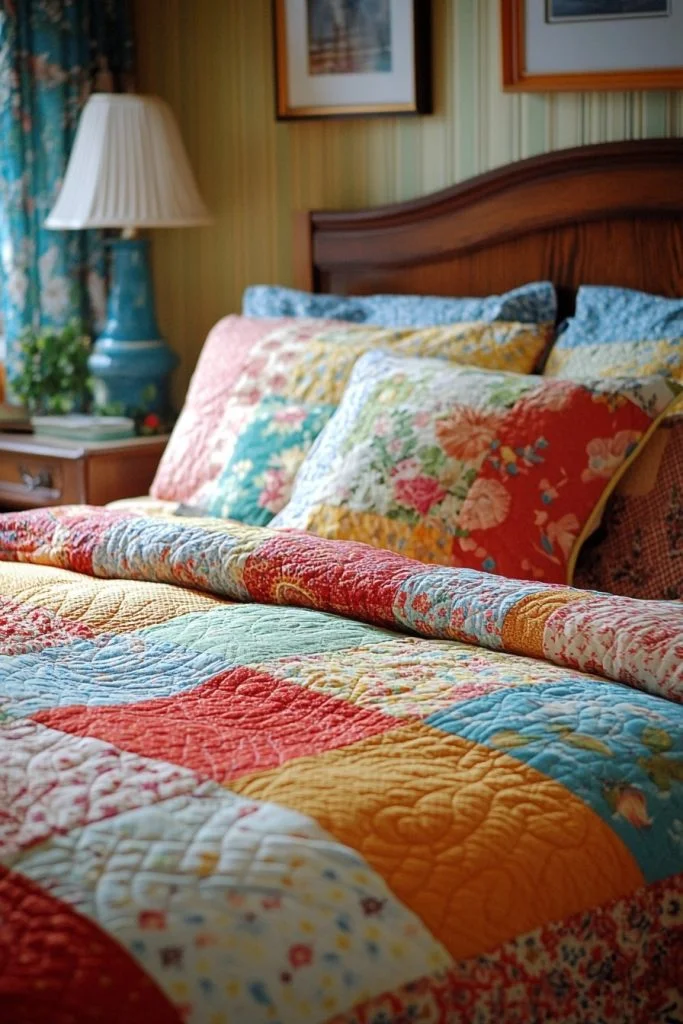 Patchwork Quilt Inspired decor uses the homely charm of patchwork quilts as the focal point in a colorful eclectic bedroom, incorporating mixed patterns and colors that exude warmth and comfort. This style celebrates handcrafted artistry, bringing a sense of nostalgia and personality to the bedroom. Combining traditional quilts with contemporary decor elements allows the bedroom to feel both time-honored and fashionable. It’s perfect for those who appreciate the beauty of handmade items.