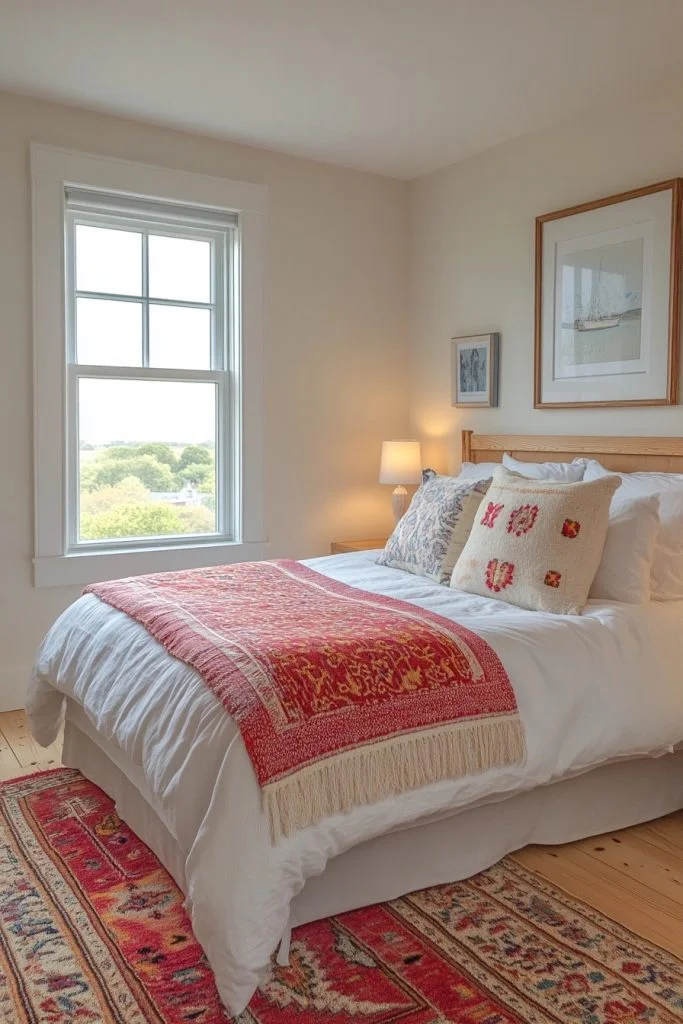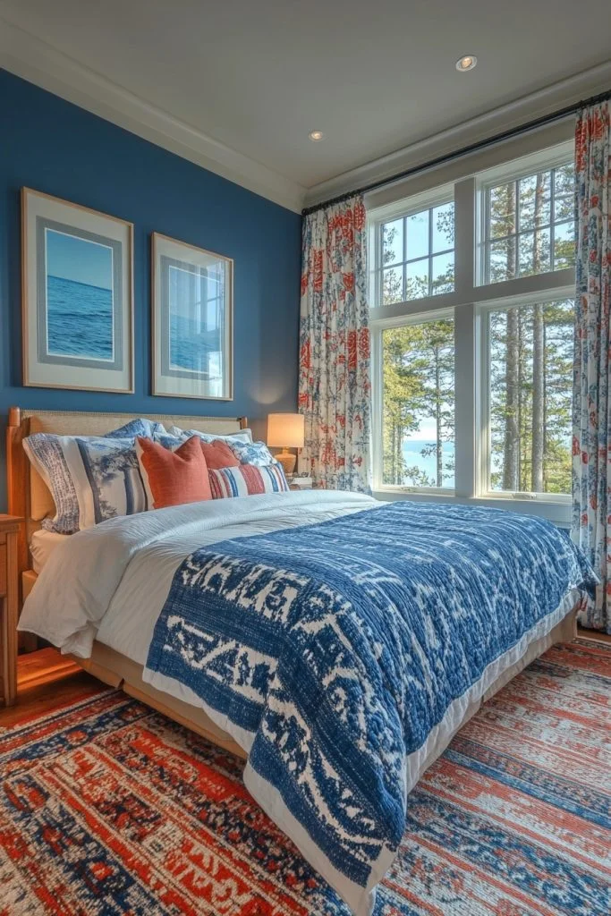 Lively Nautical Nuances infuses a colorful eclectic bedroom with elements of the sea, using blues, whites, and reds to create a maritime theme without resorting to clichés. This approach combines traditional nautical motifs with fresh, modern colors, keeping the decor light and breezy. Nautical nuances are perfect for creating a relaxed, vacation-like atmosphere in the bedroom, ideal for those who love the coast. Incorporate modern art and textiles to give a contemporary twist to the classic nautical style.