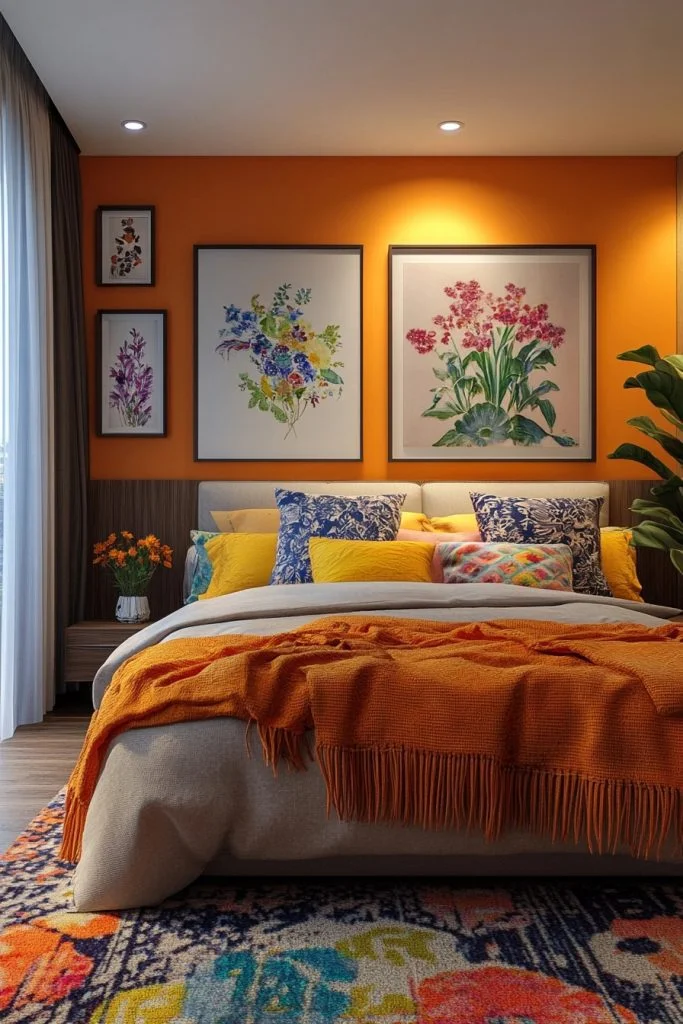Cheerful Citrus Tones use vibrant oranges, yellows, and greens to create a bright and energetic colorful eclectic bedroom. These zesty hues bring a sense of happiness and vitality to the room, making it feel lively and inviting. The eclectic mix of citrus colors can be balanced with neutral furniture and simple decor to keep the space from feeling overwhelming. This style is ideal for those who want to wake up to a burst of energy and cheer every morning.