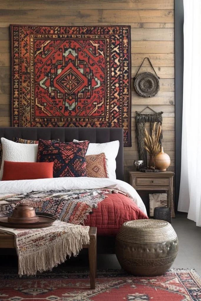 Cozy Eclectic Warmth combines rich, warm colors with eclectic furnishings to create a comfortable and inviting bedroom. This style layers different textures and patterns to add coziness and personality, making the bedroom a perfect retreat for relaxation and comfort. Warm hues like reds, oranges, and browns can be used in textiles and decor to enhance the sense of warmth, while eclectic art and unique furniture pieces add visual interest. This approach is ideal for those who want their bedroom to be a cozy haven with a touch of eclectic flair.