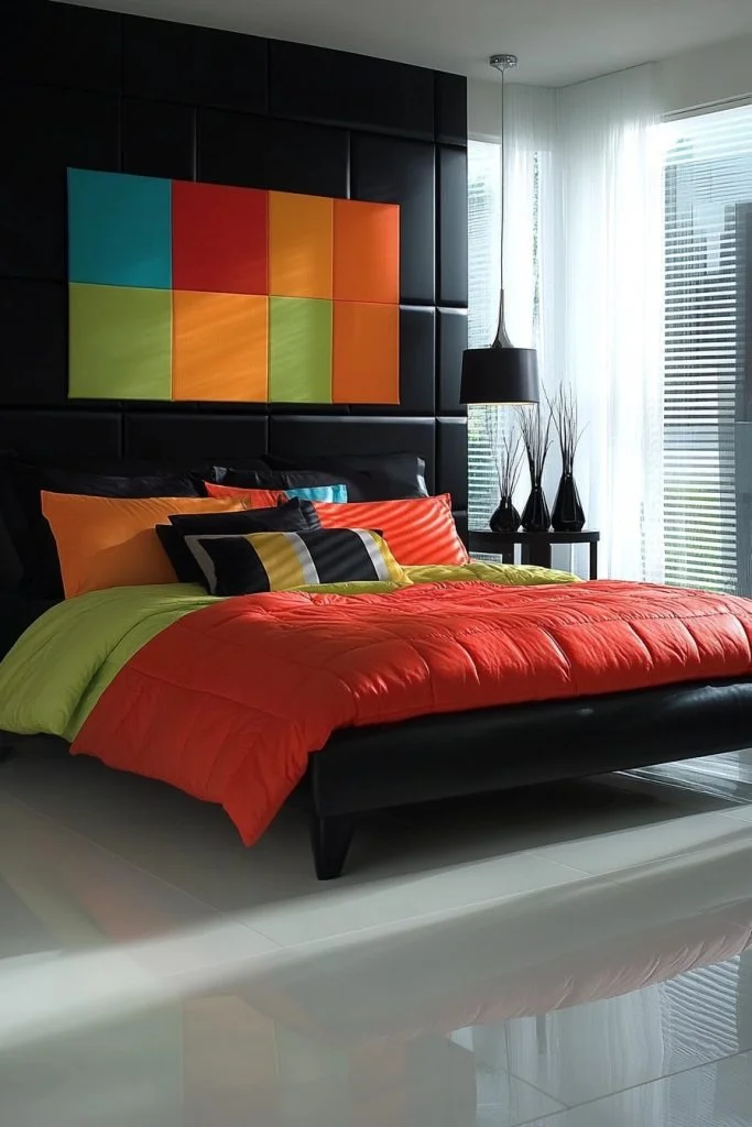 High Contrast Modern design emphasizes stark contrasts in a colorful eclectic bedroom, pairing black and white with bright color accents for a dramatic effect. This style uses clean lines and bold color blocks to create a visually striking space that remains sleek and contemporary. The high contrast setup is ideal for those who enjoy a modern aesthetic with a twist, allowing for a dynamic yet cohesive bedroom environment. Incorporate minimal decor and streamlined furniture to keep the focus on the contrasting colors.