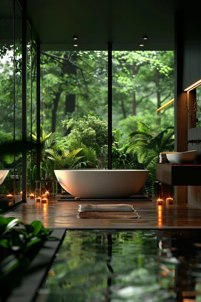 Blurring the line between inside and out, this design uses glass ceilings or wall-to-wall windows to flood the space with natural light. The abundance of sunlight is perfect for nurturing indoor plants, while natural materials like stone and wood enhance the connection to the outdoors. This type of bathroom is perfect for those who appreciate natural beauty and want a bright, open atmosphere that feels like a private greenhouse.