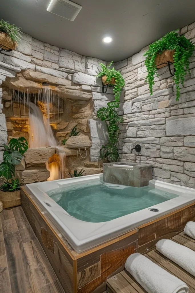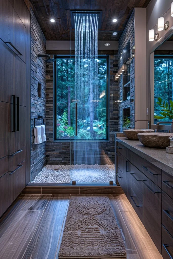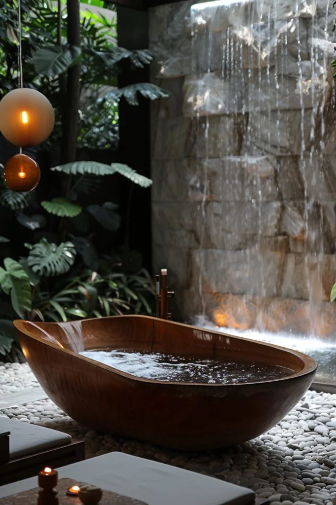Centering the design around the flow of water, this concept incorporates a waterfall feature to create a soothing auditory and visual experience. Whether it is a waterfall showerhead or a custom wall feature, the sound of falling water promotes deep relaxation. Natural stone surrounds and carefully placed plants enhance the sensory experience, turning the bathroom into a true retreat. Mood lighting and a tub positioned near the water feature allow for complete immersion in this serene setting.