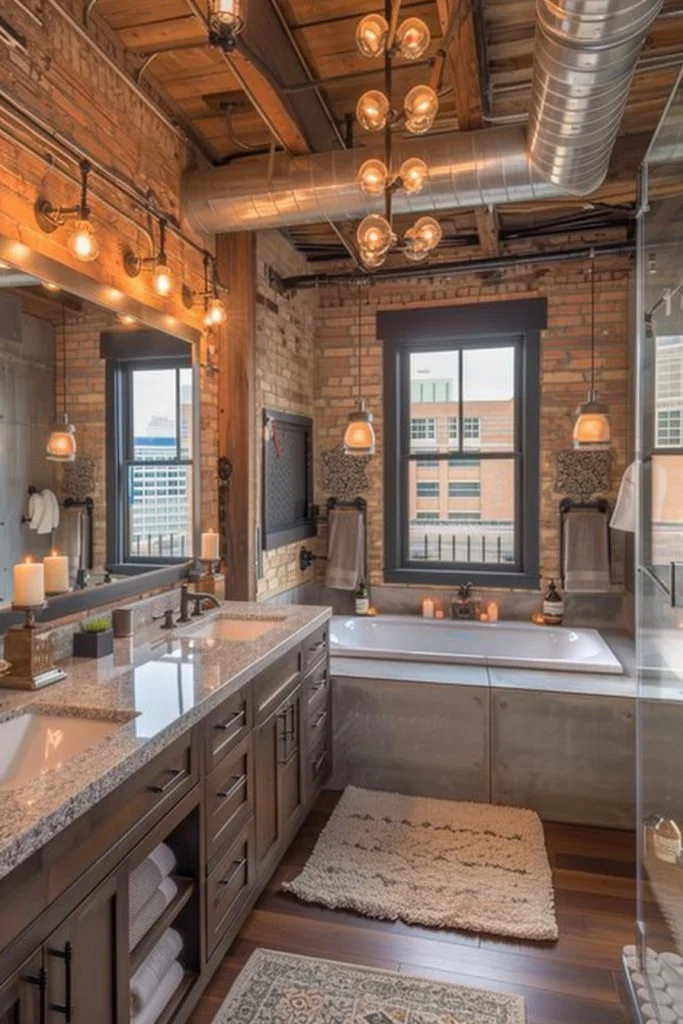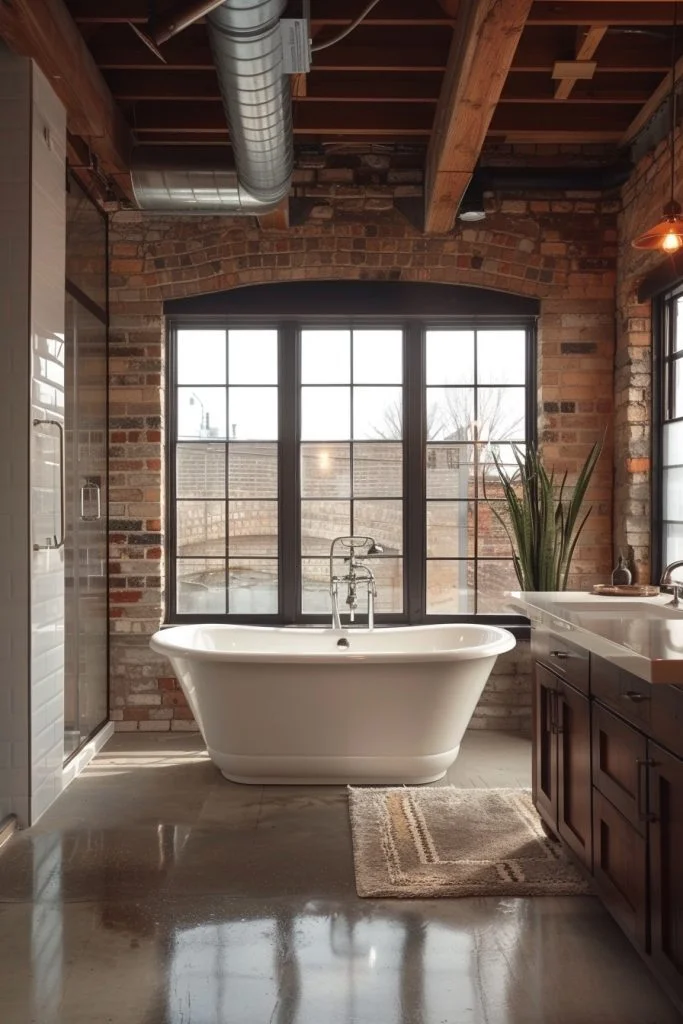 This bold design style celebrates raw architectural elements, utilizing exposed piping, distressed timber, and concrete surfaces to make a statement. Matte black fixtures and sharp geometric tiles add a modern twist to the rugged industrial theme. To prevent the space from feeling too heavy, large mirrors and frameless glass shower enclosures are used to keep the area feeling open and airy. This style is ideal for those who appreciate an edgy, urban aesthetic that combines toughness with refinement.