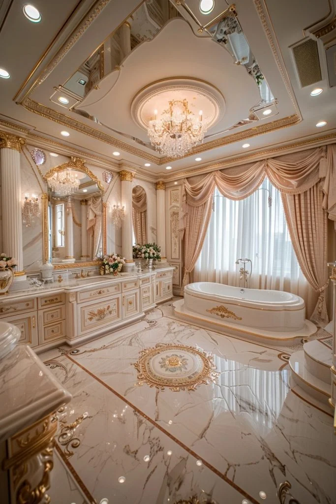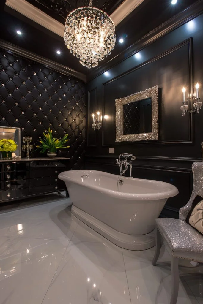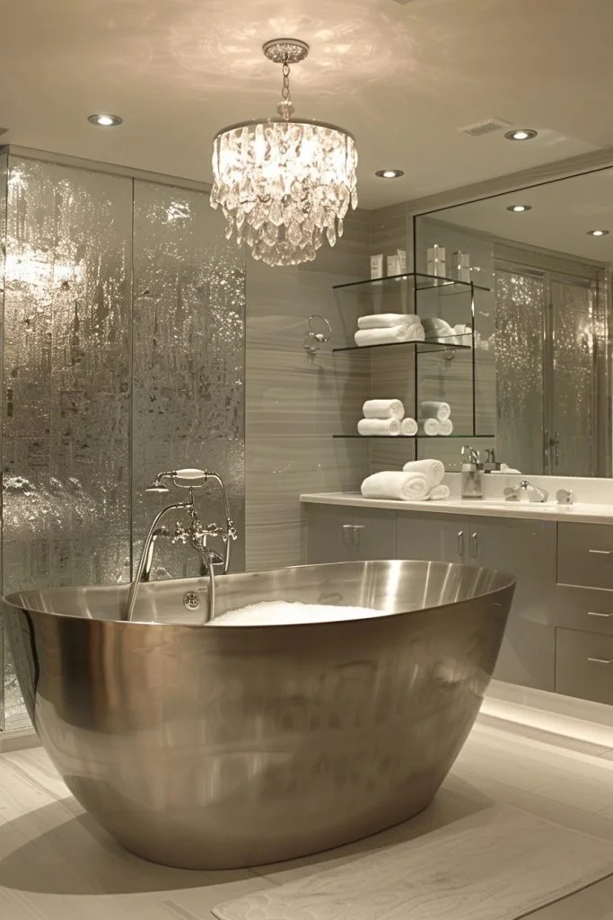 This design is all about high-impact shine and drama. Reflective surfaces such as polished marble, mirrored vanity cabinets, and high-shine metallic finishes are used to bounce light around the room, creating a bright and expensive feel. Opulent touches, such as a crystal chandelier or velvet vanity chair, add to the luxurious atmosphere. This bathroom is ideal for those who desire a chic, fashion-forward space to get ready in each day.