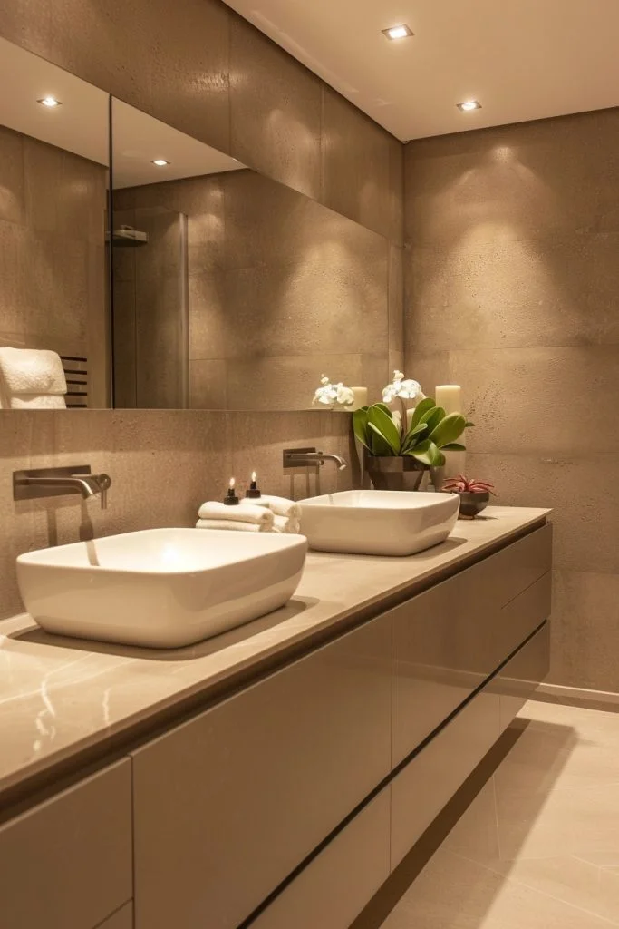 Imagine a bathroom designed specifically to pamper you, featuring indulgent amenities such as a deep soaking tub, an expansive rainfall shower, and radiant heated floors. The lighting is kept soft and warm, while plush, high-quality towels mimic the atmosphere of an exclusive spa. To ground the space, natural stone tiles and warm wood accents are used, bringing the soothing elements of nature indoors. This type of bathroom serves as a private escape, allowing you to wash away the stress of daily life in absolute comfort.