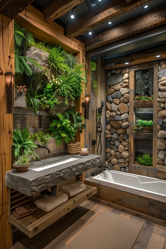 This design beautifully bridges the gap between heritage charm and contemporary convenience. It features architectural elements like exposed natural wood beams and rough stone walls, contrasted against sleek, modern bathtubs and sinks. This balance of old and new creates a unique, homey atmosphere that is warm yet stylish. Freestanding tubs and open-concept showers blend seamlessly with the rustic decor, offering high-end comfort without losing the cozy cabin feel.
