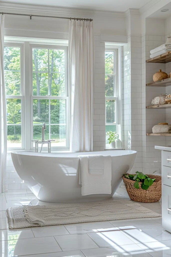 Evoke the soothing essence of the seaside with a bathroom featuring light, breezy color schemes and natural textures. Accents of seashell and sea glass, paired with light-colored wooden vanities, mimic the calmness of a beach retreat. Large windows dressed in sheer draperies allow for ample natural lighting, enhancing the airy and fresh feel of the space. This style is perfect for homeowners looking to create a serene, vacation-inspired sanctuary within their own home.