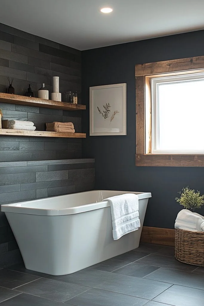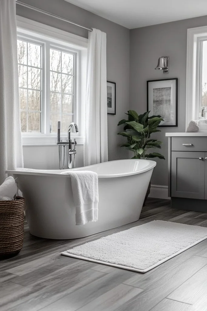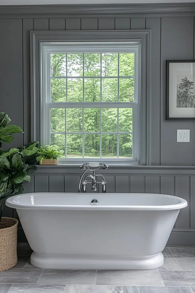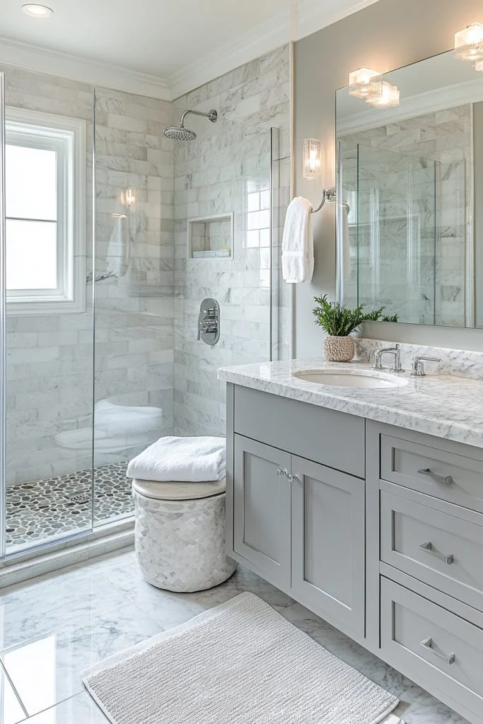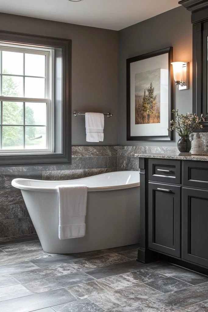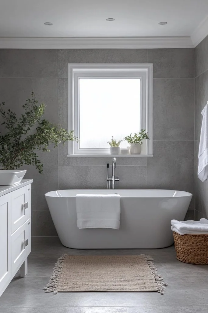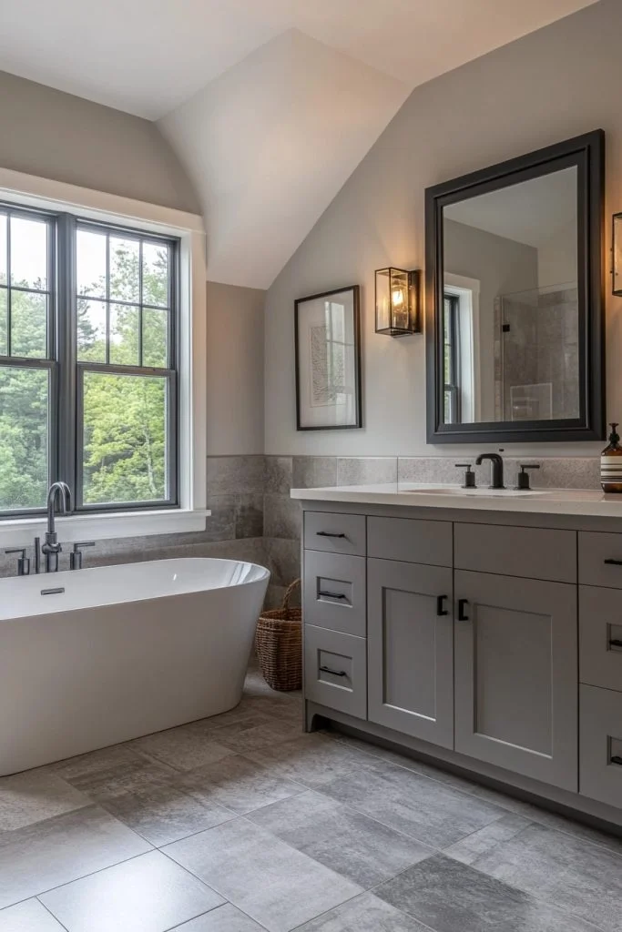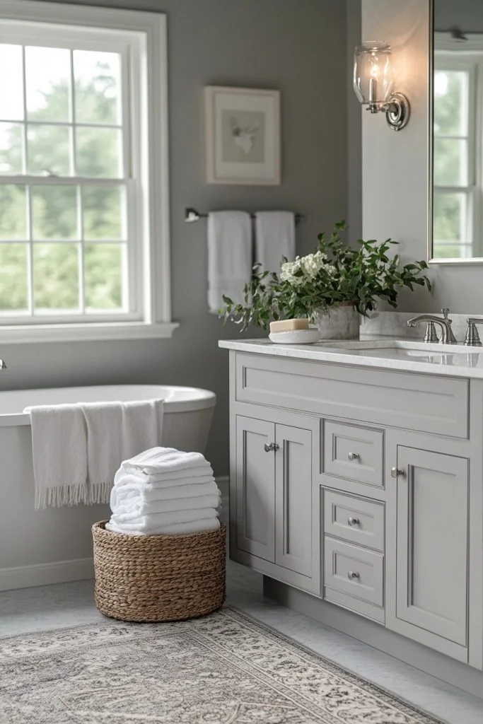 Dove grey delight focuses on soft, warm grey tones that convey comfort and softness. Use dove grey paint for the walls and complement it with slightly darker grey tiles for a subtle contrast. White trim and fixtures keep the space light and airy, while plush towels and a fabric shower curtain in matching dove grey add texture. Introduce elements like a vintage-inspired light fixture to add charm.