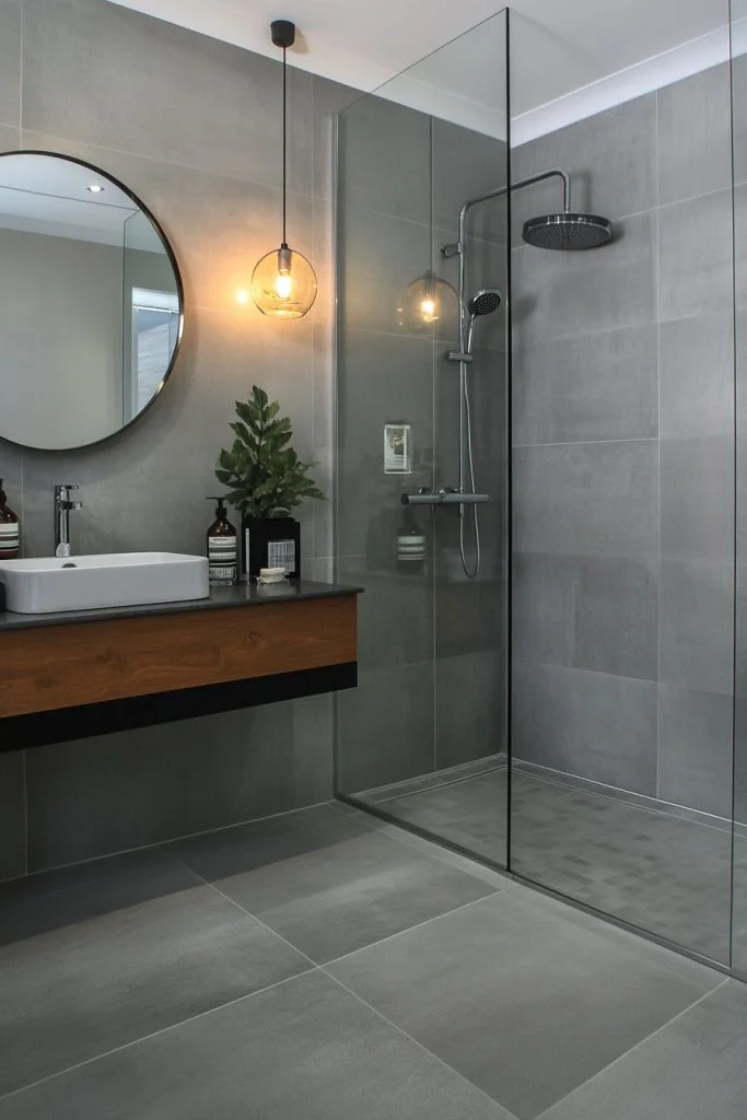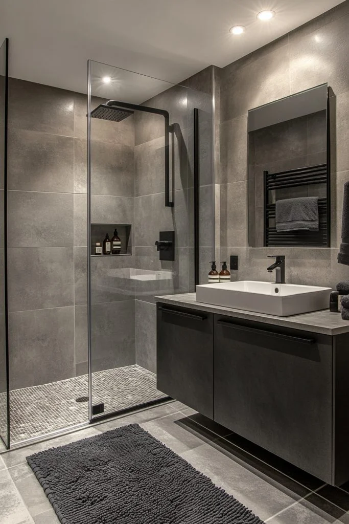 Shadow grey sophistication uses deep, shadowy tones of grey to create a chic, mysterious vibe. Combine matte shadow grey walls with high-gloss tiles in a darker shade for a play on textures and light. Sleek, modern fixtures in brushed nickel can complement the shadow tones, adding a touch of shine without overwhelming the subtle sophistication of the grey palette.