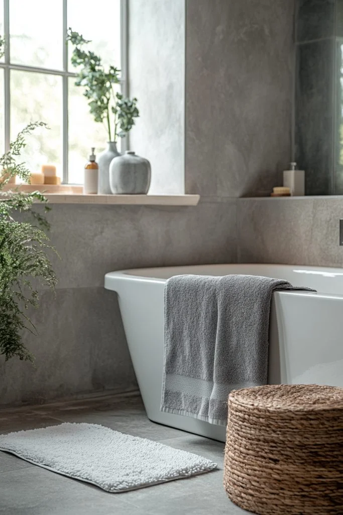 One of the most impactful ways to introduce grey into a bathroom is through texture. A concrete statement wall—whether real poured concrete, concrete-effect tiles, or a specialized plaster finish—adds an instant industrial-chic vibe. The raw, matte finish of concrete provides a beautiful, grounding backdrop for other elements. To soften the look, pair it with warm wood accents, such as a floating vanity or teak shelving. This juxtaposition of cold, hard stone with warm, organic wood creates a balanced and inviting atmosphere that feels modern and spa-like.