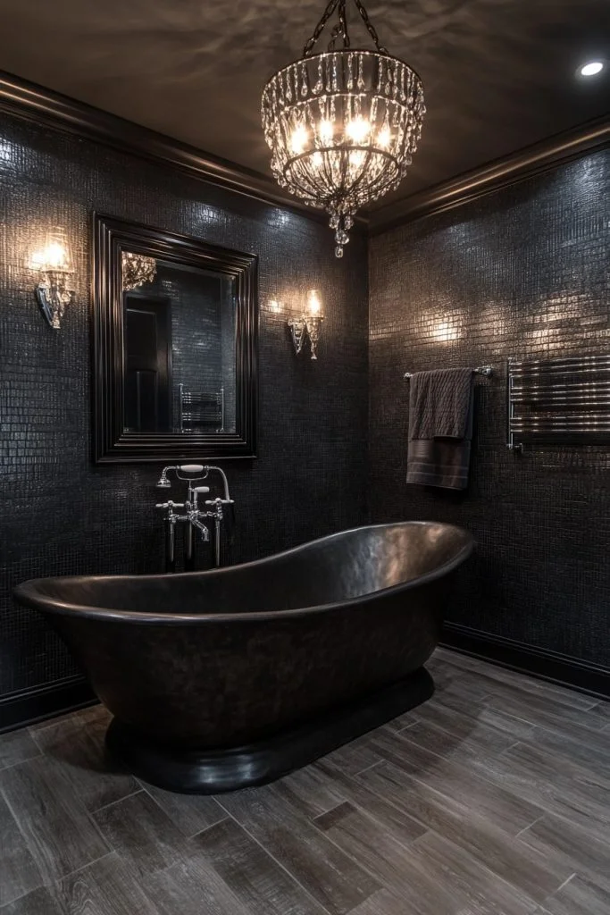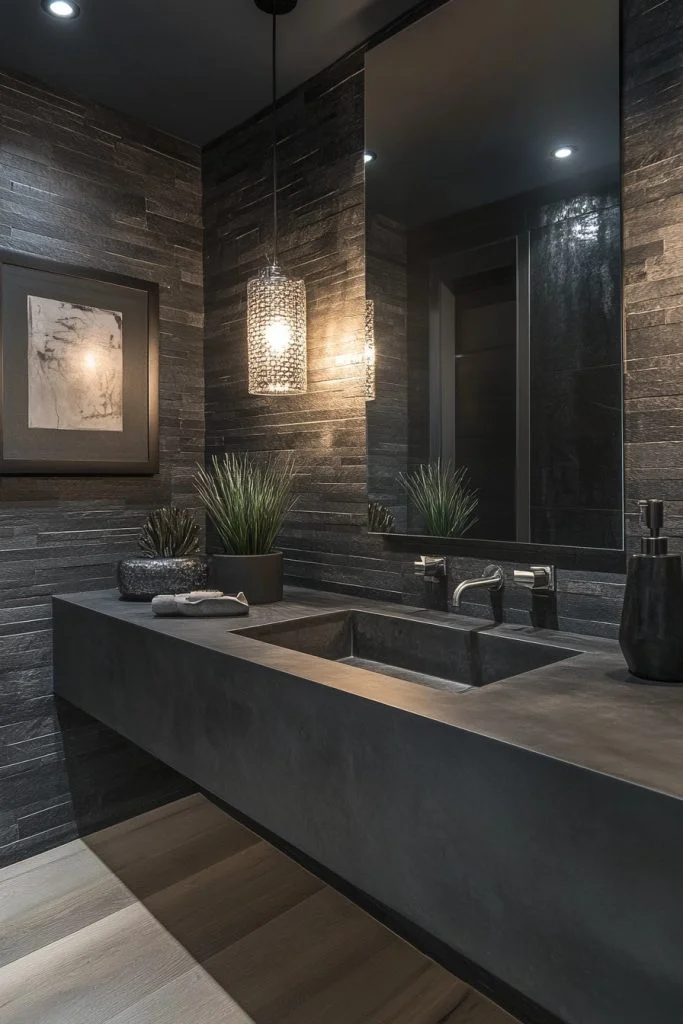 Dark grey drama brings a bold, intense approach, utilizing dark grey tones to create a striking and powerful aesthetic. Contrast dark grey stone tiles with bright white fixtures and sharp, angular lighting to emphasize the dramatic color scheme. Accents in red or electric blue can add a dynamic pop of color to the monochromatic palette. A high-gloss black vanity and a few reflective decor pieces like a metallic vase can enhance the opulent feel.