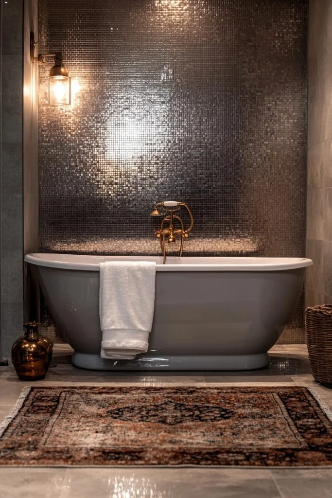 Steel grey splendor emphasizes the sleek, strong look of steel grey. This shade works well with polished chrome fixtures and fittings, enhancing the metallic theme. Incorporate a feature wall of steel grey tiles in a large format, creating a dramatic backdrop for a freestanding tub. Keep other walls lighter to avoid overwhelming the space, and use plenty of mirrors to reflect light.