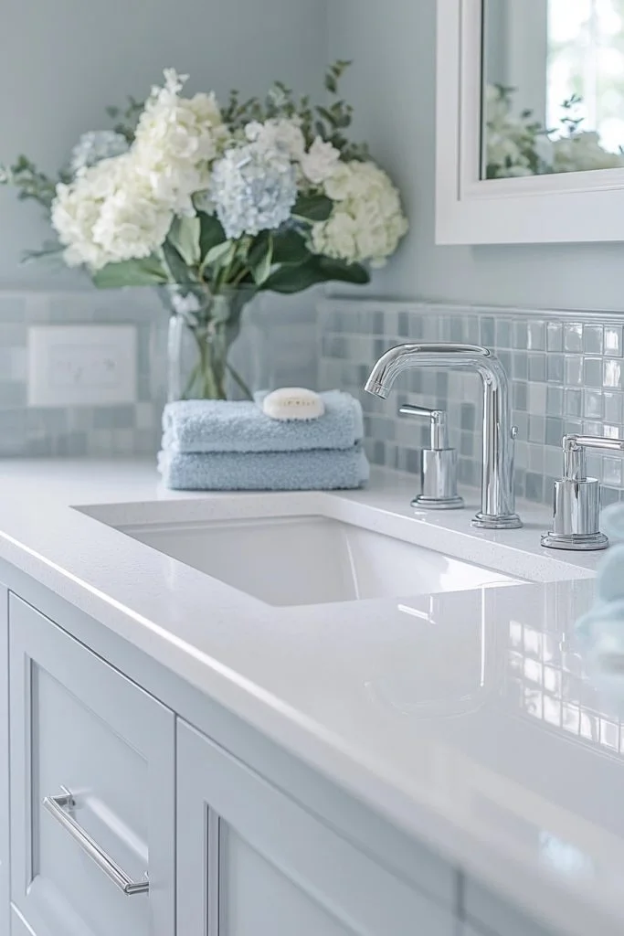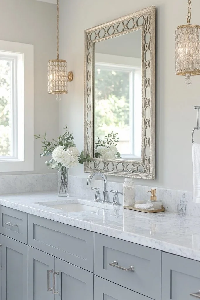 Silver grey shine introduces metallic elements, incorporating silver-toned accessories and fixtures to create a sparkling, clean look. Use reflective silver wallpaper or tile accents to catch and distribute light throughout the space. Chrome fittings, a silver-framed mirror, and glossy grey cabinetry can contribute to the luminous effect. Soft grey textiles and a touch of crystal in light fixtures can enhance the luxurious feel.