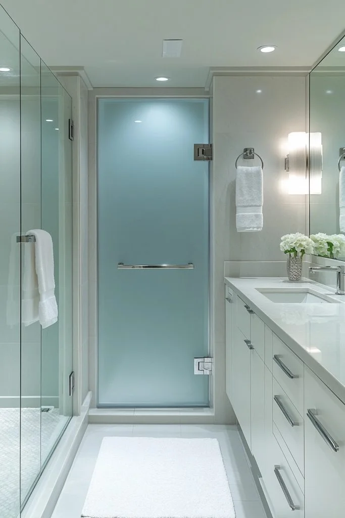 Frosted grey finery brings an elegant, gentle approach, featuring frosted glass elements that diffuse light for a soft, glowing effect. Use frosted glass shower doors and pair them with light grey walls and flooring for a serene, cohesive look. Silver accents, such as towel bars and faucet handles, add a subtle sparkle. A white ceiling and soft, dimmable lighting keep the atmosphere light and luxurious.