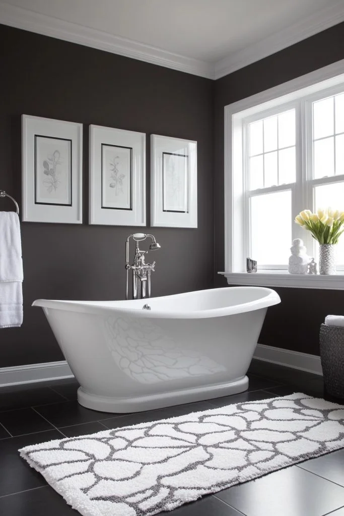 Charcoal chic embraces the dramatic and bold aspects of grey decor, featuring deep charcoal walls for a moody, sophisticated effect. This design pairs well with glossy white subway tiles and silver accents to brighten the space and add a luxurious feel. A statement piece, such as a contemporary art print or a sculptural light fixture, can serve as a focal point against the dark walls. Matte black fixtures and a glass shower enclosure maintain the chic, modern aesthetic.