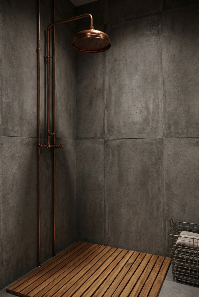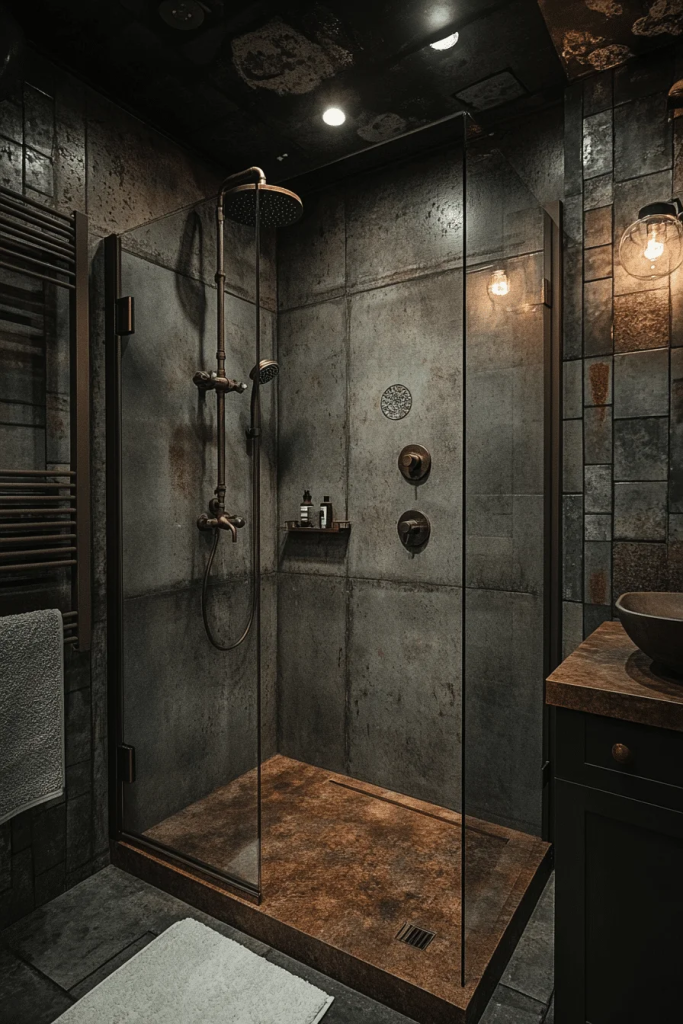 One of the hallmarks of industrial design is celebrating the “guts” of a building. Instead of hiding plumbing behind drywall, make it a feature. An exposed pipe shower system, typically in copper or matte black, acts as a functional sculpture. The raw metal against a simple tiled or concrete wall creates an authentic, factory-like aesthetic. It adds instant character and a steampunk edge to the bathroom, proving that necessary elements can also be beautiful design statements.