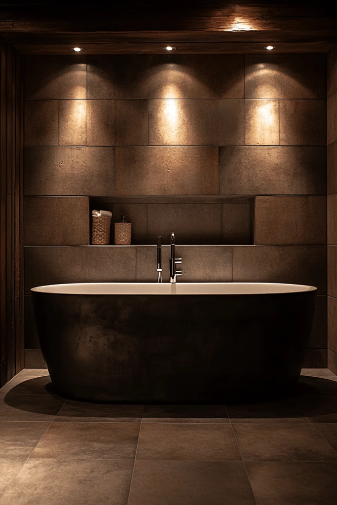 An industrial spa bathroom with steel fixtures combines the luxurious feel of a spa with the edgy, raw elements of industrial design. Features like a steel soaker tub and minimalist taps emphasize the sleek, modern aspects of the style. Neutral tones and textured walls create a calming environment, ideal for relaxation. The strategic use of soft lighting and warm wooden accents adds a soothing touch to the otherwise stark decor.