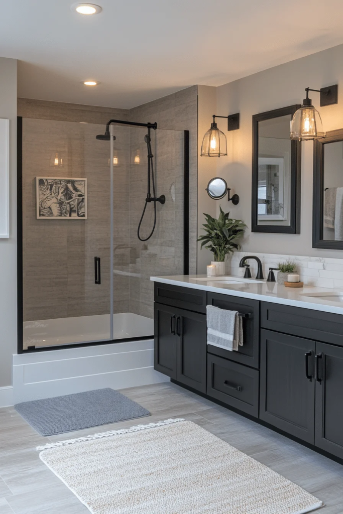 An industrial-style bathroom with black fixtures makes a dramatic statement, contrasting starkly with lighter walls and floors. This style is all about bold, visual contrast and clean lines, with fixtures that stand out as both functional pieces and decorative elements. The use of a monochrome color scheme keeps the space cohesive and modern, while textured surfaces like concrete or stone add depth and interest.