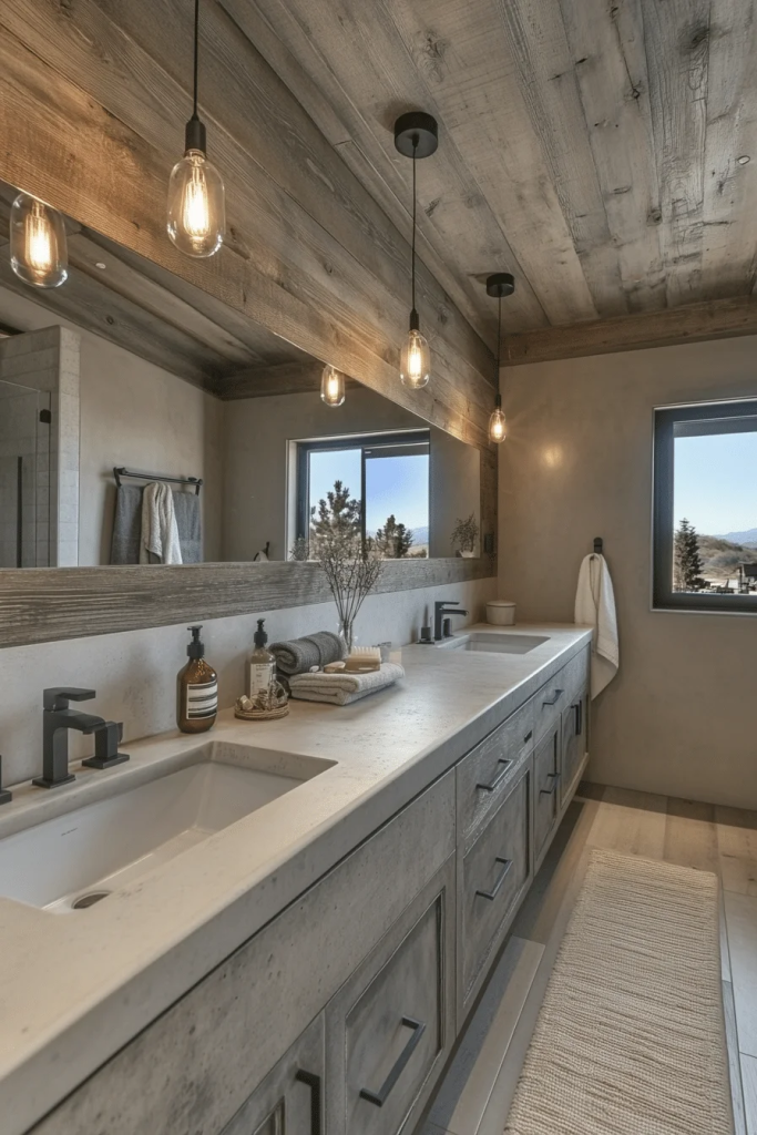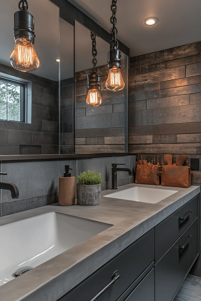 This rustic industrial bathroom combines weathered wood textures with metal accents for a rugged, durable look. The incorporation of iron hardware and copper piping adds authenticity to the style, creating an environment that feels both rustic and refined. Oversized metal light fixtures and a wood-slab countertop enhance the visual interest of the space. Ideal for those who appreciate a touch of old-world charm in their modern bathroom.