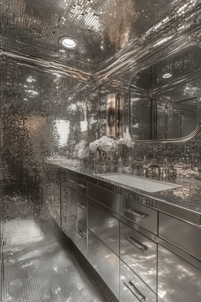 A polished industrial bathroom with metallic surfaces offers a sleeker take on industrial design, featuring shiny metals and smooth finishes. This style focuses on reflective surfaces like chrome or stainless steel, used in fixtures and accessories to add a modern, upscale feel. The use of polished metals helps to brighten the space, while maintaining the minimalist and functional characteristics of industrial decor.