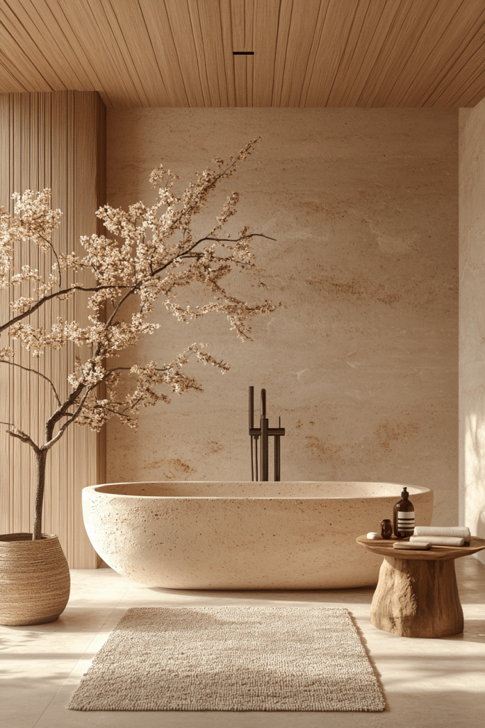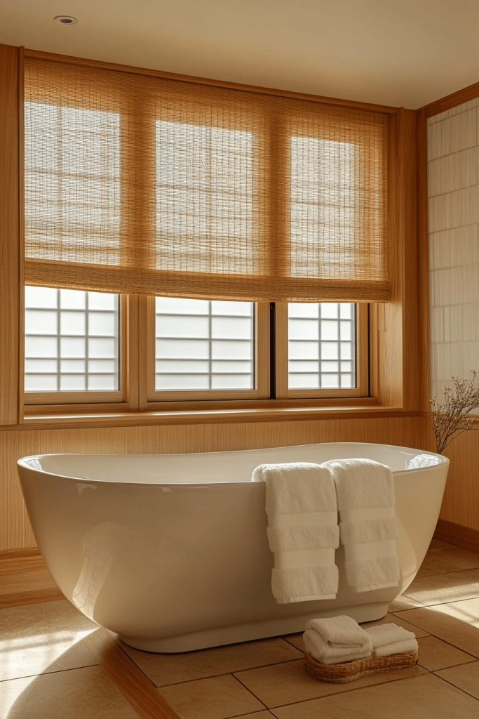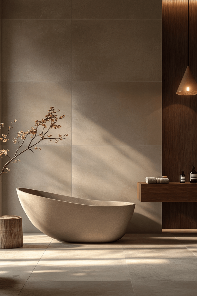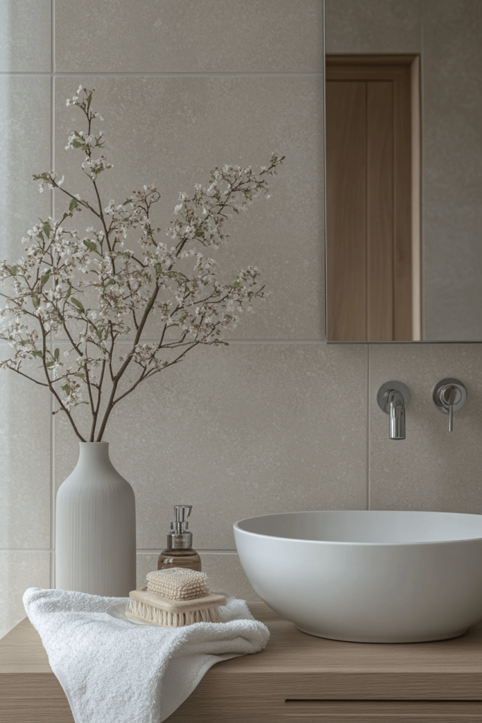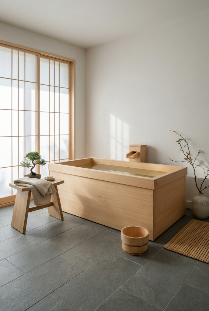 One of the most authentic ways to introduce Japandi style is through Hinoki wood. This Japanese cypress is prized for its soothing lemon-scented aroma and resistance to humidity. Incorporate a Hinoki wood stool, bath mat, or even a soaking tub rim to bring a tactile, sensory element to the room. The warm, blonde tone of the wood pairs perfectly with the cool whites and greys typical of Scandinavian design, bridging the gap between the two cultures effortlessly.