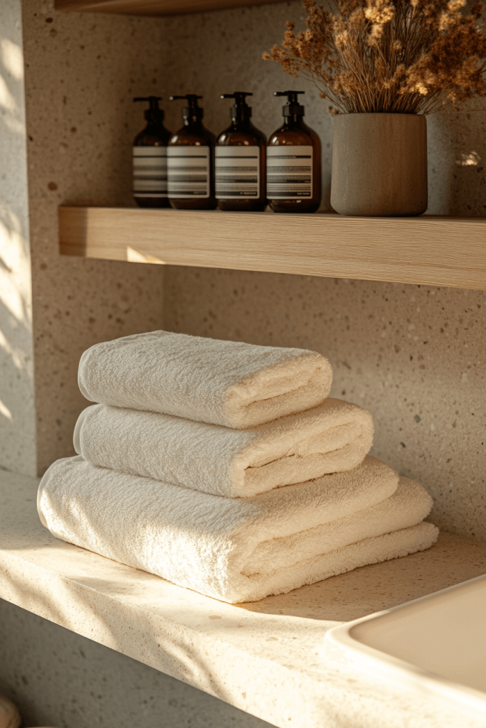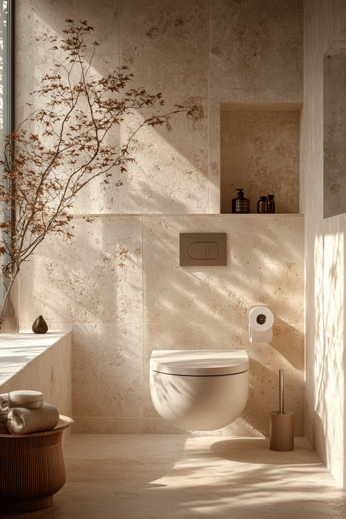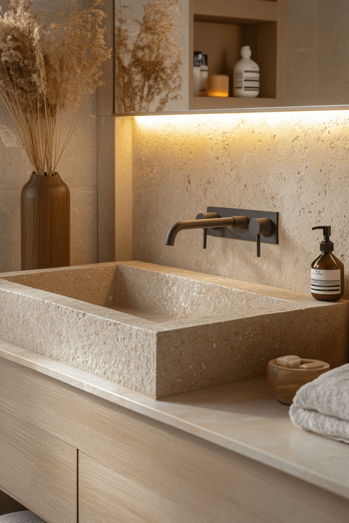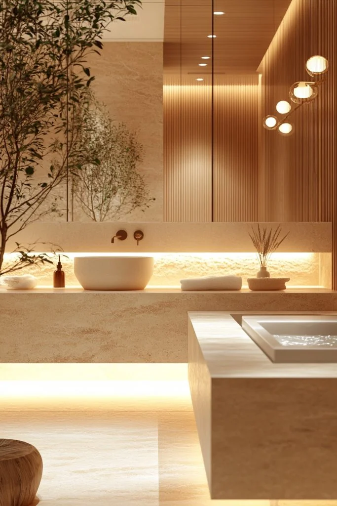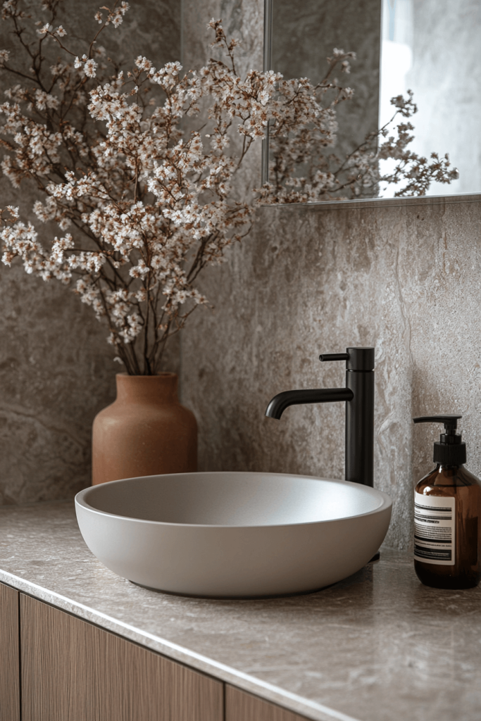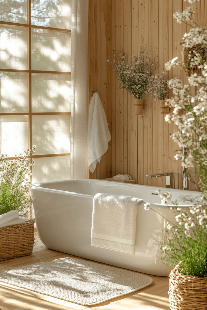 One of the most authentic ways to introduce Japandi style is through Hinoki wood. This Japanese cypress is prized for its soothing lemon-scented aroma and resistance to humidity. Incorporate a Hinoki wood stool, bath mat, or even a soaking tub rim to bring a tactile, sensory element to the room. The warm, blonde tone of the wood pairs perfectly with the cool whites and greys typical of Scandinavian design, bridging the gap between the two cultures effortlessly.