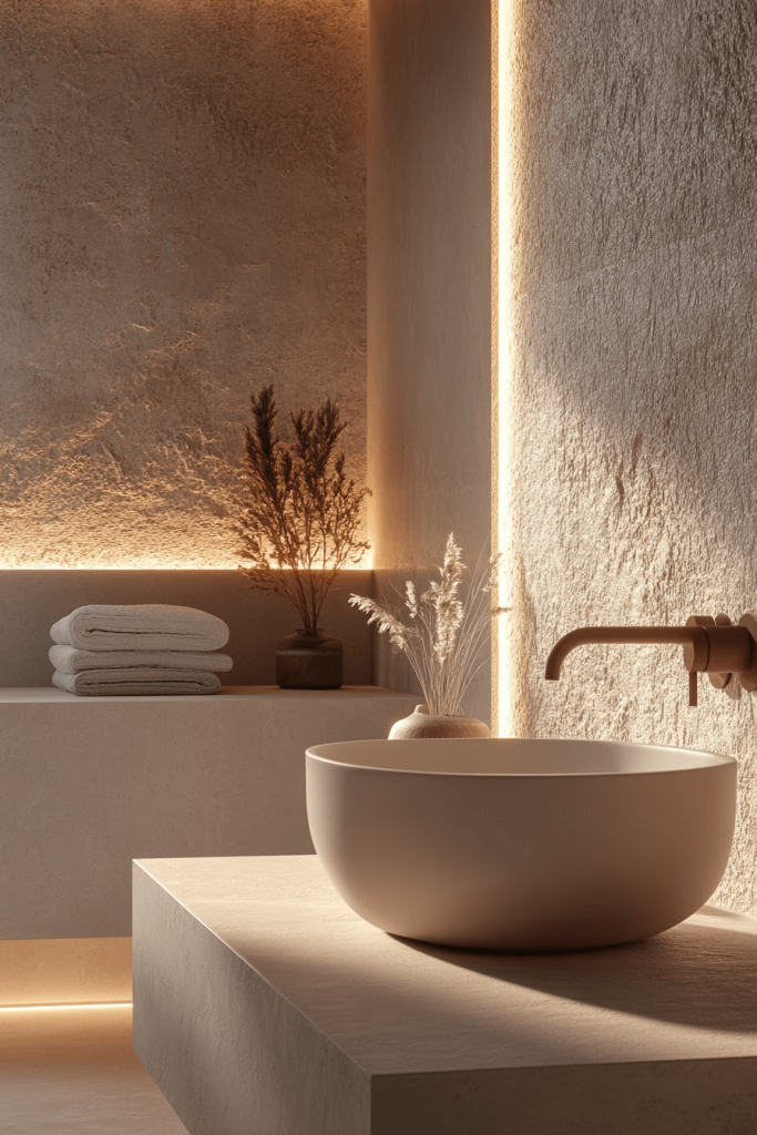 The Minimalist Water Sanctuary is all about creating a clean, open space that promotes relaxation. It features sleek, functional fixtures and a monochrome color palette that emphasizes purity. The minimalist decor helps reduce visual clutter, allowing the natural beauty of materials like stone and ceramic to stand out. This bathroom is ideal for those seeking a serene retreat from the hustle and bustle of everyday life.