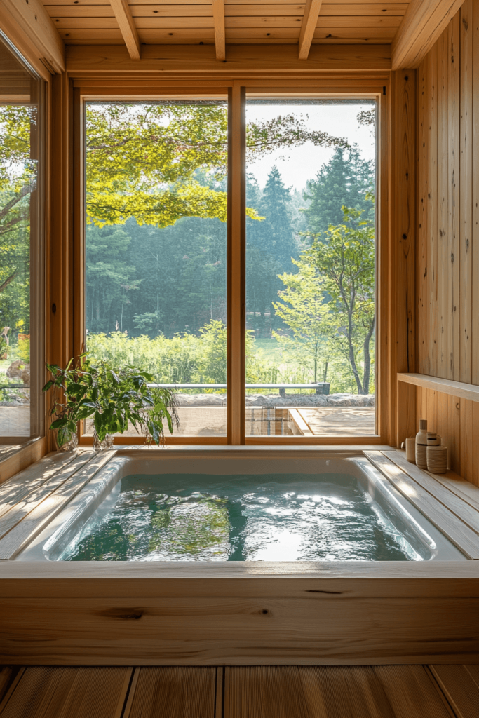 The Zen Soak Space is inspired by traditional Japanese bathhouses (“onsen”), featuring elements that promote relaxation. It includes a deep soaking tub, natural wood surroundings, and calming, neutral tones. The space is designed to be a sanctuary where one can unwind and rejuvenate in peace. This bathroom is ideal for those looking to incorporate spa-like elements into their home.