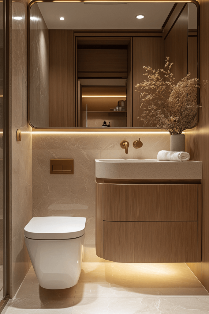 The Softly Lit Lavatory emphasizes a soft, diffused lighting scheme that creates a warm atmosphere. It uses light-colored woods and neutral tones to enhance the natural light. The minimal use of decor keeps the focus on the quality of materials and craftsmanship. This bathroom is ideal for those who prefer a gentle, soothing light in their personal care spaces.