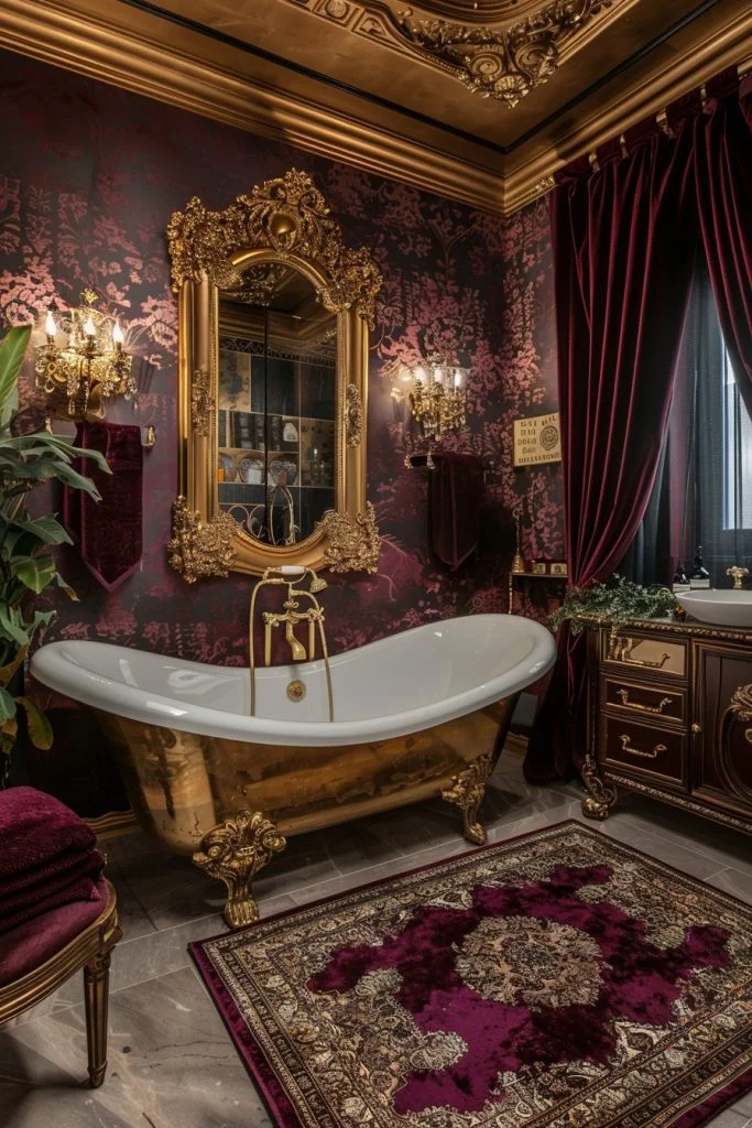 Royal Gold Luxe epitomizes traditional luxury, using gold to create a space that feels grand and imposing. This style might include a gold-painted clawfoot tub, heavy gold-framed oil paintings, and plush golden rugs. The lavish use of gold creates a regal atmosphere that is both inviting and impressive. Rich colors like deep red, royal purple, or emerald green can complement the gold, adding to the aesthetic. This decor is ideal for those who aspire to live with the grandeur of royalty in their own homes.
