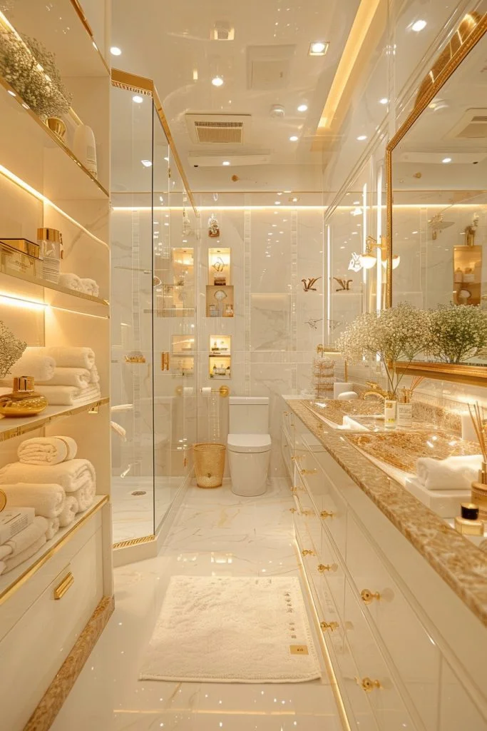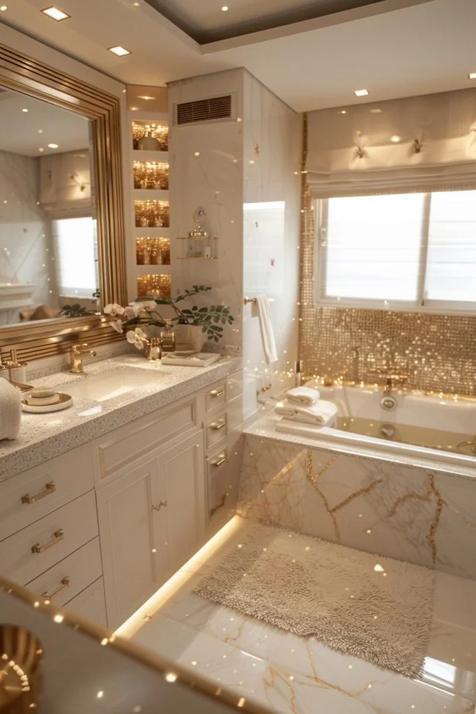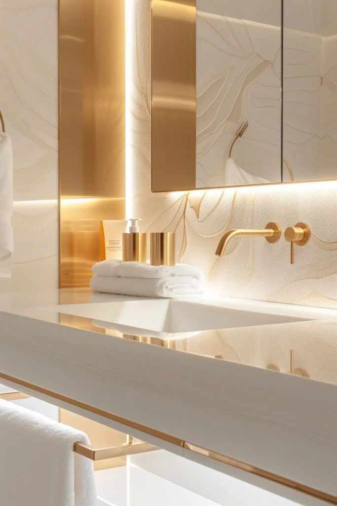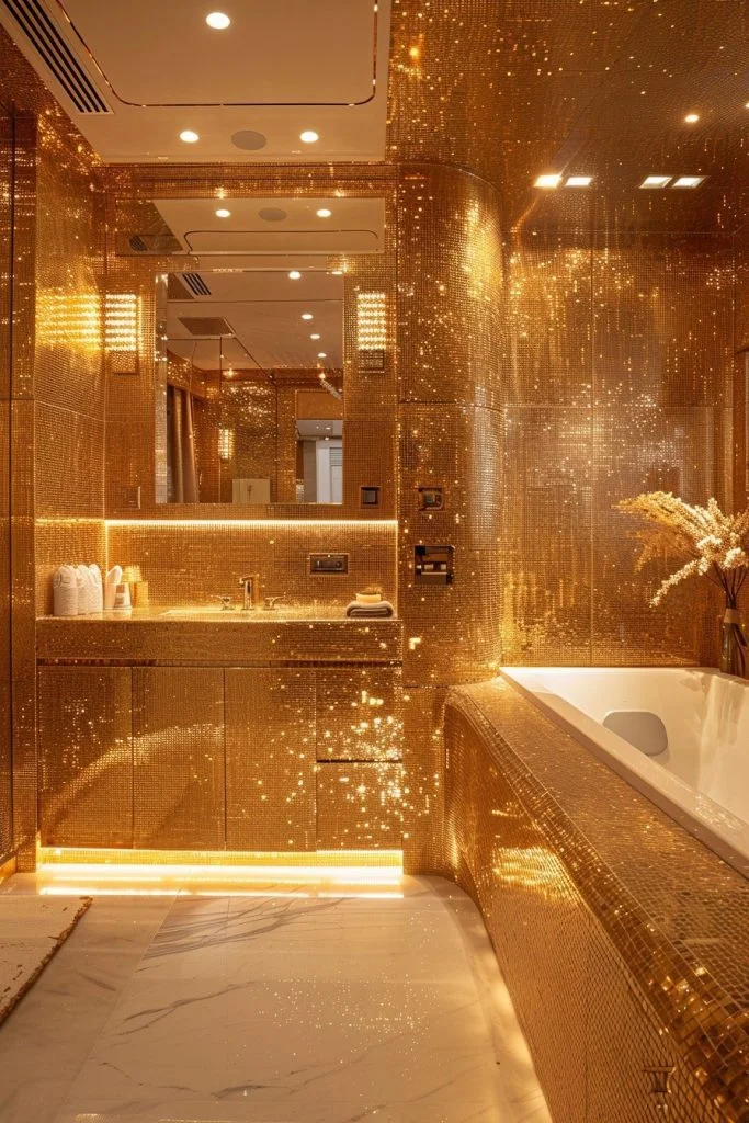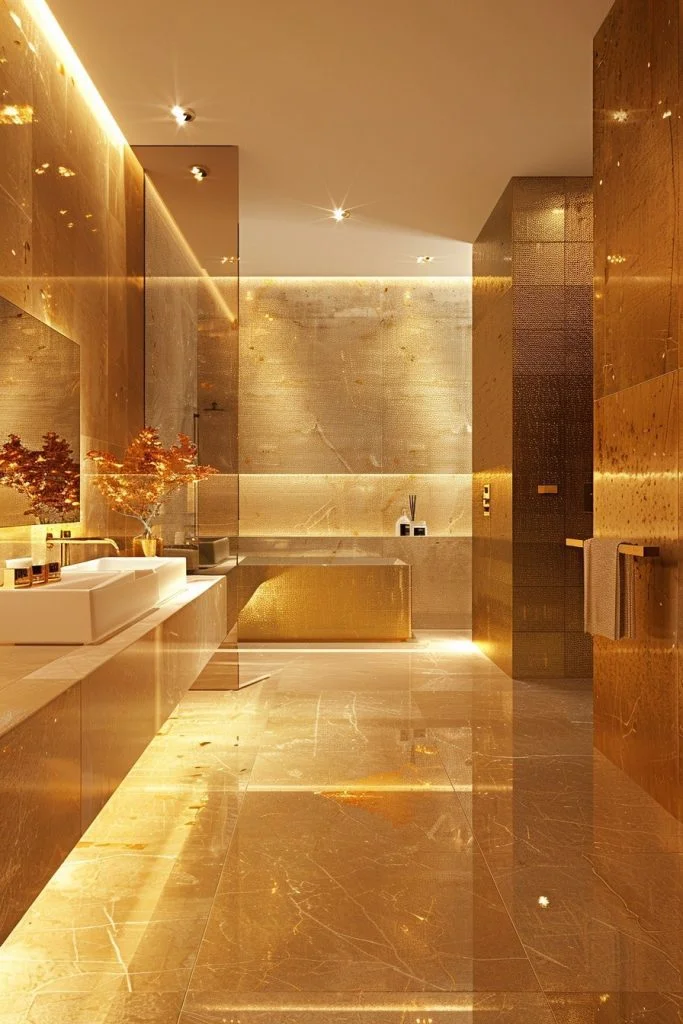 Gilded Gold Reflections features highly reflective surfaces to maximize the luminosity of the room. This style uses large mirrors, glossy tiles, and polished gold fixtures to create a space that sparkles. The reflections multiply the effect of the gold, making the bathroom feel larger, brighter, and more glamorous. Soft lighting can amplify the reflective surfaces, adding a magical, jewelry-box quality to the decor. This style is perfect for those who love a glamorous, high-energy bathroom environment.
