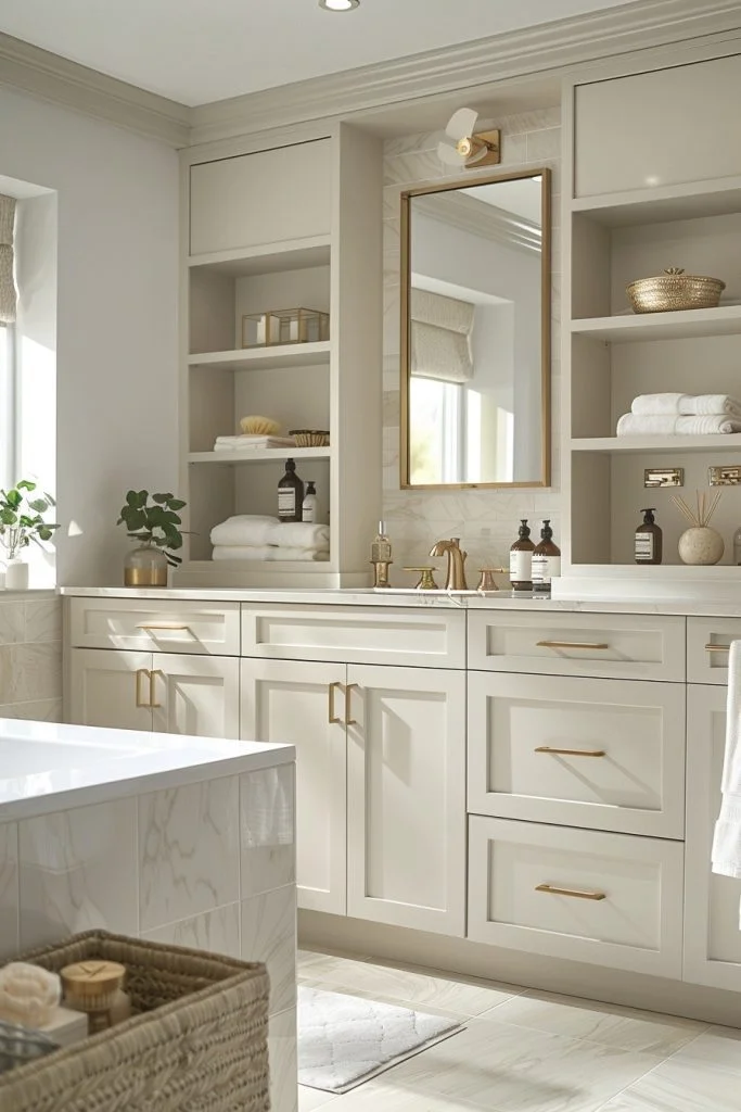 For those who prefer a more restrained approach, Modern Gold Elegance offers the perfect balance between contemporary design and timeless beauty. This style features sleek, minimalist gold fixtures set against a clean backdrop of crisp white or soft dove gray. The key is to use gold as a highlight rather than the main event—think a thin gold frame on a round mirror or slender gold cabinet handles. The uncluttered, linear design ensures that the space feels open and airy, while the gold elements add a necessary layer of warmth and sophistication. It is an ideal aesthetic for the modern minimalist who still craves a touch of luxury.
