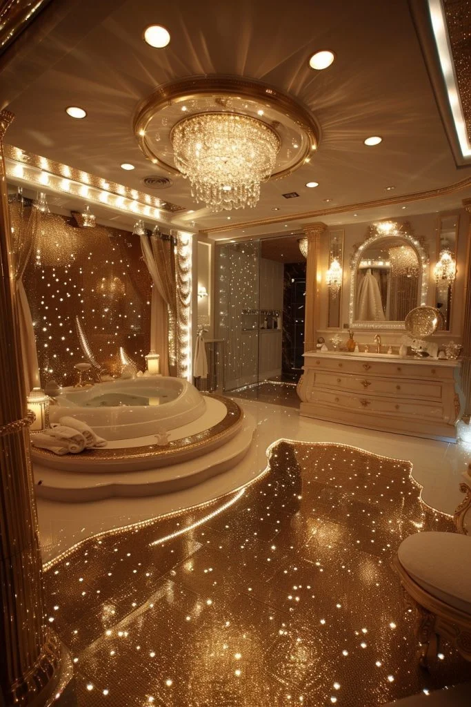 Glamorous Gold and Crystal combines the sparkle of cut glass with the richness of metal for a dazzling effect. This style often features crystal chandeliers, glass vanity knobs, and gold faucets, creating a bathroom that shimmers from every angle. The reflective surfaces of both materials amplify the light, making the bathroom appear brighter and more spacious. Elegant glass shelves displaying perfume bottles or crystal jars further enhance the glamour. This decor is ideal for those who love a sophisticated, high-shine atmosphere that feels effortlessly chic.