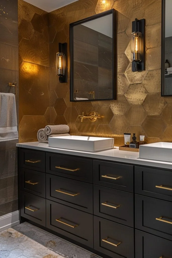 Geometric Gold Chic incorporates gold into modern, structured patterns to create a dynamic space. This can be achieved through wallpaper with gold geometric lines, hexagonal gold tiles, or light fixtures with angular gold frames. The combination of the timeless appeal of gold with contemporary shapes creates a stylish and visually interesting environment. Accents like a geometric gold mirror or wire baskets can enhance the theme. The contrast between sharp lines and the soft luster of gold makes the bathroom look both modern and luxurious.