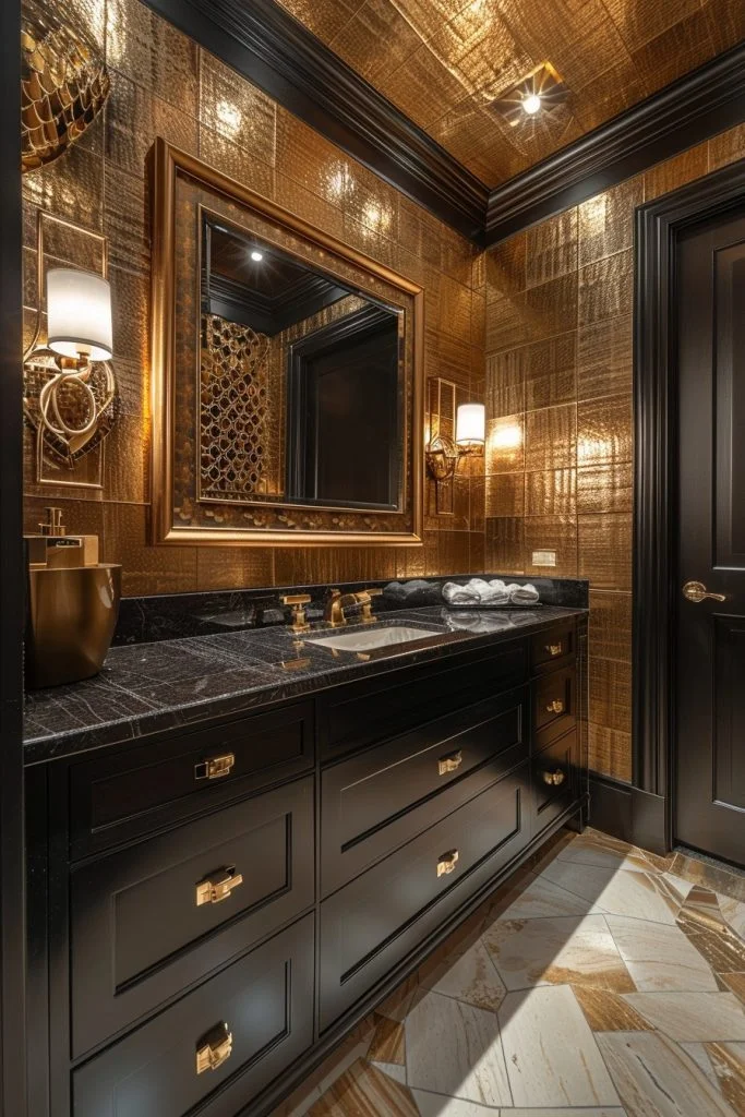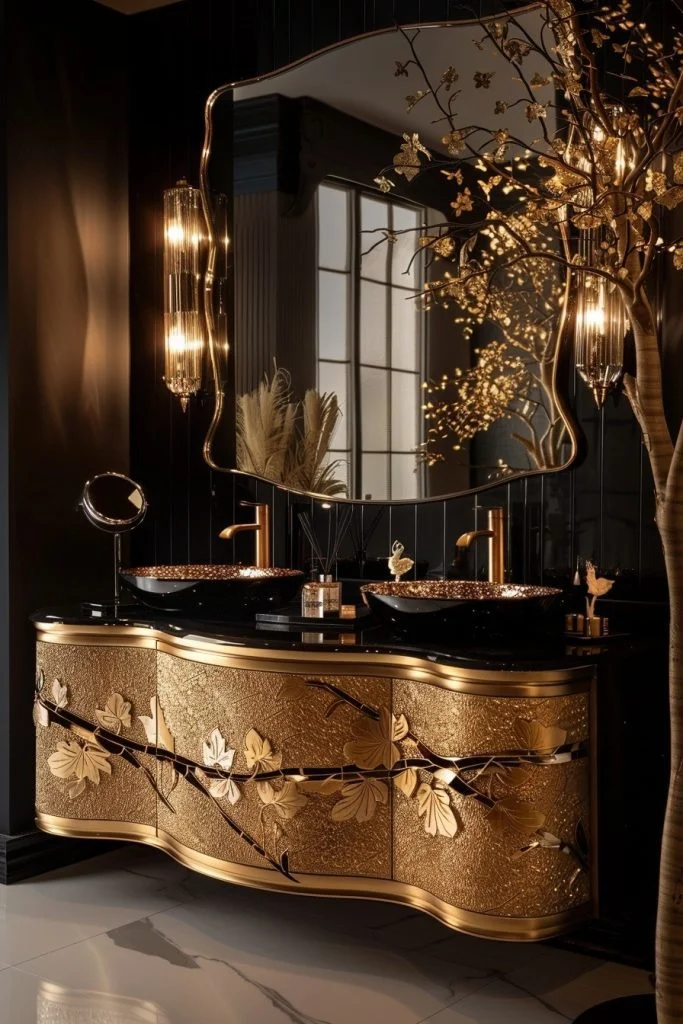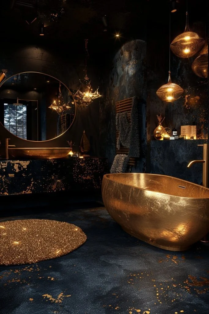 Midnight Gold Mystery combines deep, dark colors like navy, charcoal, or black with bright gold accents to create a moody and luxurious atmosphere. This style often features gold-trimmed furniture, gold plumbing fixtures, and warm lighting that stands out dramatically against the dark backdrop. The contrast enhances the drama of the space and highlights the richness of the metal. Dim, warm lighting is key to enhancing the mysterious ambiance. This decor is perfect for those who love a bathroom that feels intimate, cozy, and incredibly chic.