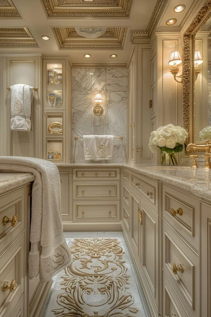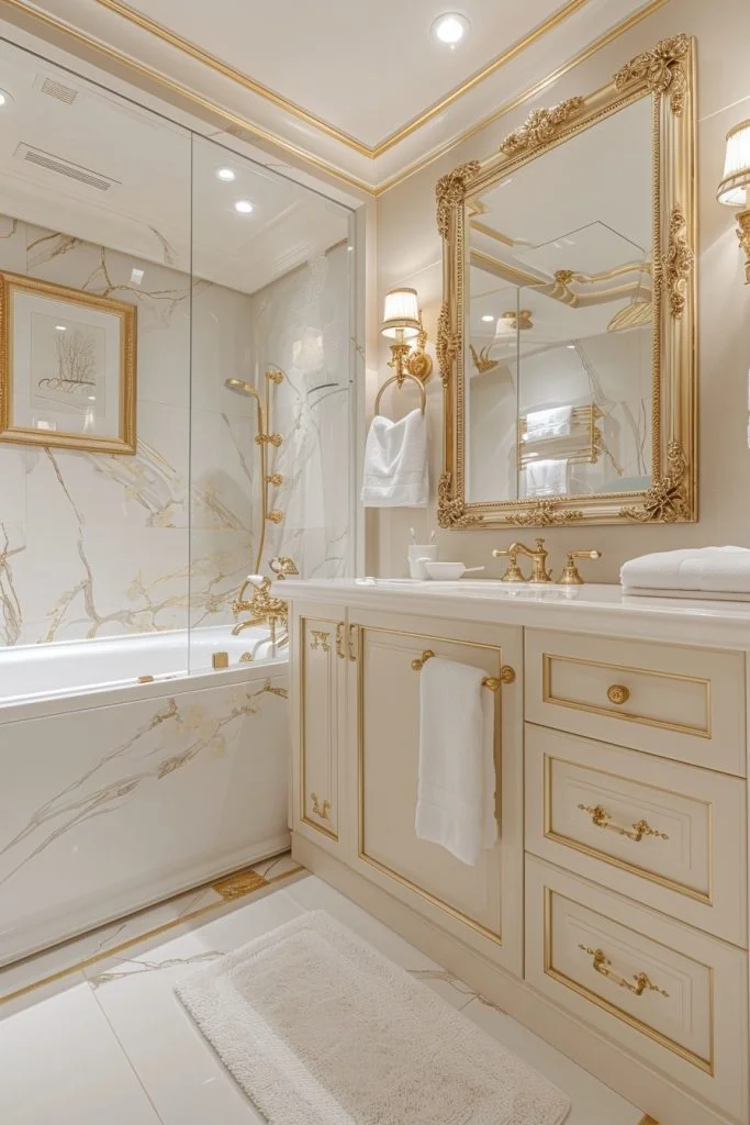 Timeless Gold Detailing focuses on the subtle, intricate use of gold in classic bathroom designs. This style includes features like delicate gold scrollwork on vanity cabinets, detailed gold trim on mirrors, and ornate gold sconces. The attention to detail in the metalwork adds a sense of craftsmanship and heritage to the space. Subtle color palettes like ivory, soft beige, or pastel blue complement the gold detailing, allowing it to stand out as an artful element. This style is ideal for those who love a bathroom that showcases detailed, artisanal work and quiet luxury.