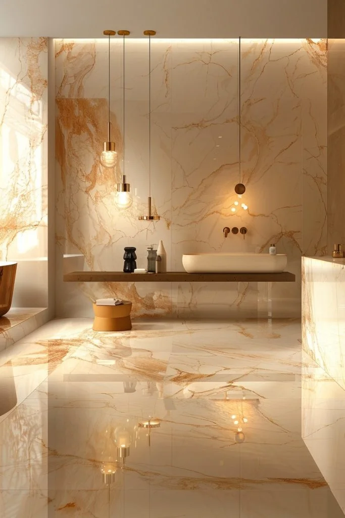 Bold Gold Veins features the dramatic beauty of natural stone with striking gold veining. This style uses large slabs of marble, quartz, or granite with bold gold streaks for countertops, walls, or flooring. The natural patterns of the stone enhance the uniqueness of the bathroom, making it feel custom and high-end. Pairing these dramatic materials with simple fixtures allows the stone to be the focal point. This decor is perfect for those who appreciate the organic beauty of nature combined with the luxury of gold.