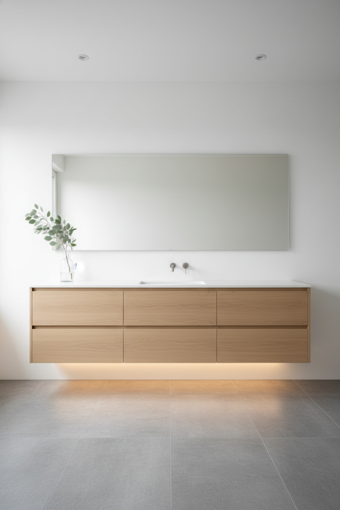 One of the most effective ways to enhance the feeling of space in a minimalist bathroom is to install a floating vanity. By mounting the cabinetry to the wall and leaving the floor underneath visible, you create an uninterrupted line of sight that makes the room appear larger and airier. This design choice also simplifies cleaning and adds a modern, architectural touch. Pair it with under-cabinet LED lighting to create a soft, ethereal glow at night, further emphasizing the “floating” illusion and adding a layer of warmth to the clean lines.