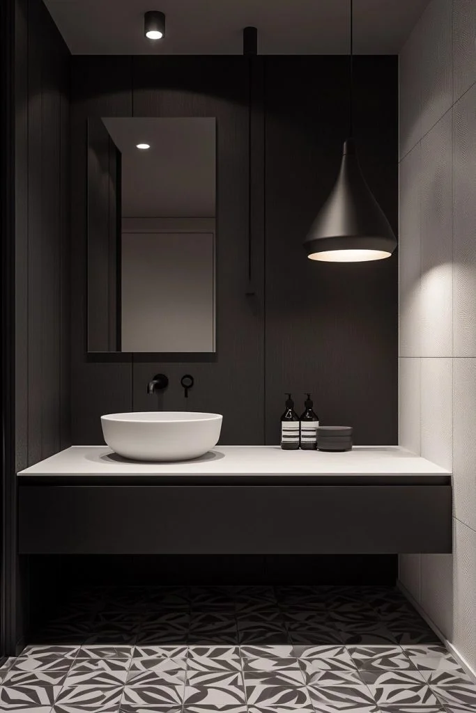 This style utilizes sharp contrasts to define architectural zones within a minimalist framework. Imagine a charcoal feature wall in an otherwise white room, or dark grout lines highlighting geometric tiles. These visual anchors create interest without the need for physical decor items. The layout remains simple and effective, focusing on essentials like a sleek vanity and a large, frameless mirror. It is perfect for those who want their bathroom to make a bold, graphic statement.