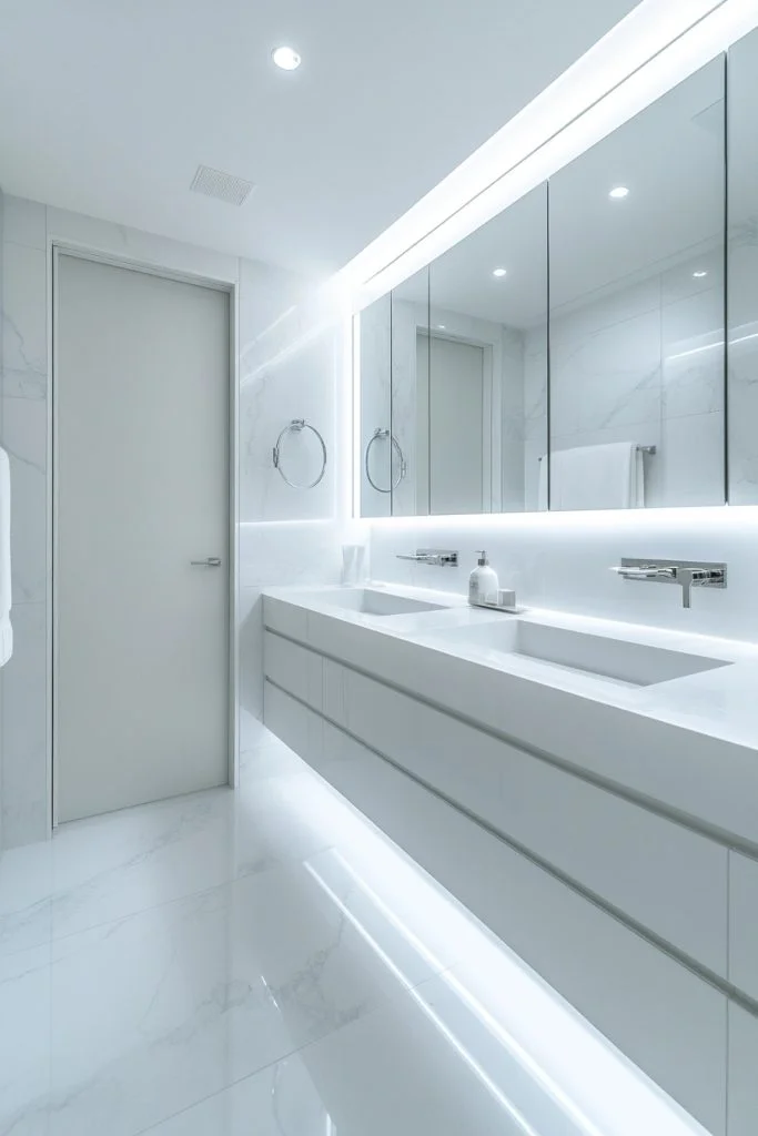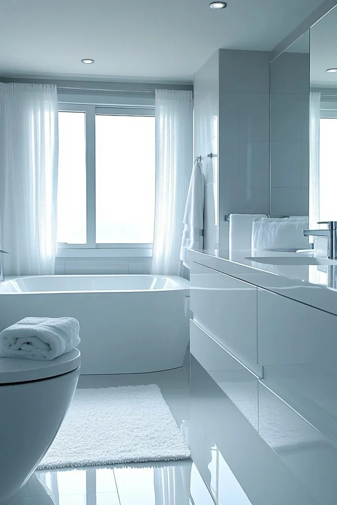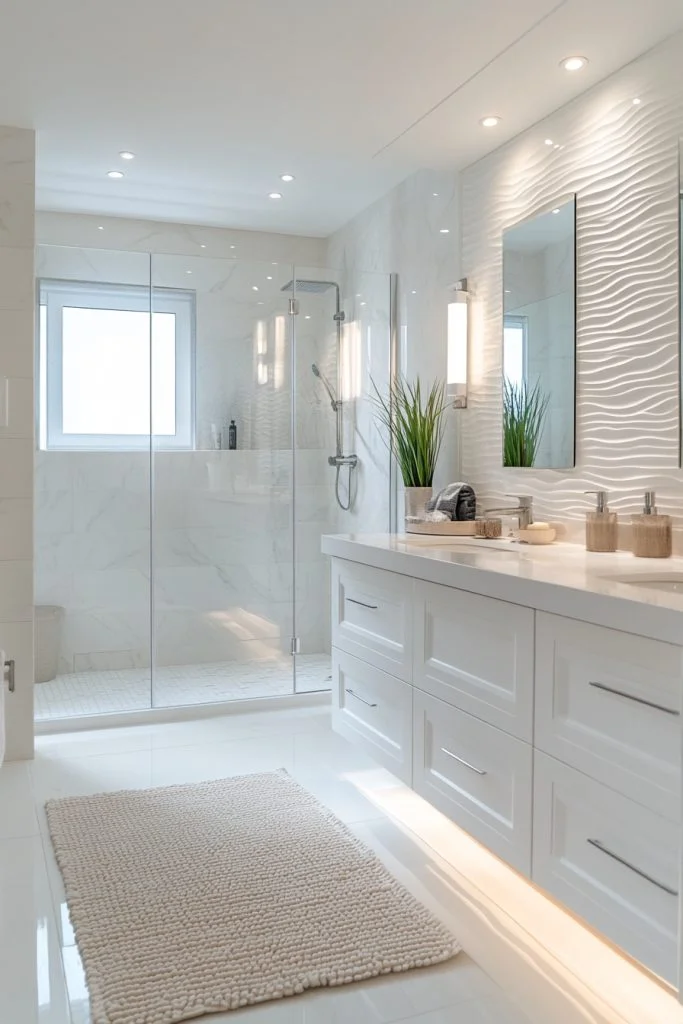 In this design, white is not just a color but a state of mind. The use of all-white fixtures, tiles, and textiles creates a serene and expansive feel. To prevent the room from feeling sterile, subtle textures—such as matte finishes, white-on-white patterns, or fine stone—are introduced to add depth. The layout focuses on smooth lines and functional simplicity, promoting a calm, cloud-like atmosphere.