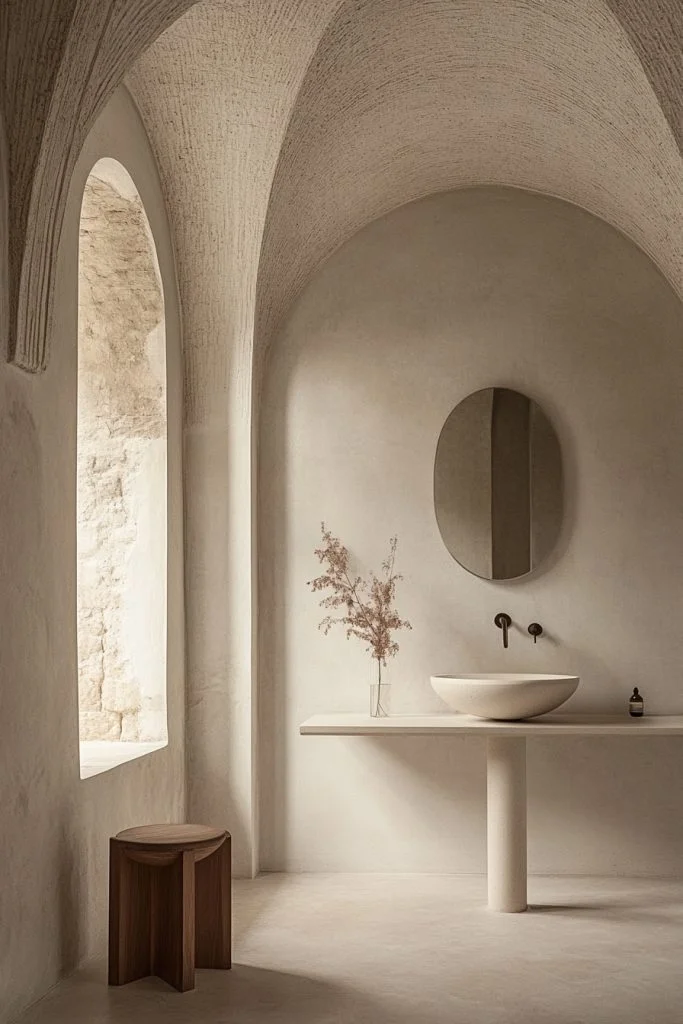 Inspired by the profound simplicity of monastic living, this design focuses purely on essentials. The aesthetic is austere yet beautiful, featuring plain plaster walls, simple brass or copper fixtures that patina over time, and a muted color scheme. The space is designed to induce calm and reflection, free from the distractions of modern ornamentation.