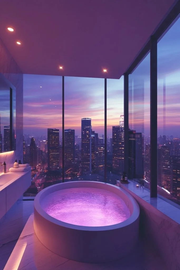 Designed to highlight urban panoramas, this bathroom features large windows that frame the city. The interior design is minimal, with sleek, low-profile furniture and a monochromatic color scheme that doesn’t compete with the vibrant view outside. Ambient lighting is designed to enhance the nighttime cityscape, making the view a dynamic backdrop to the minimalist interiors.
