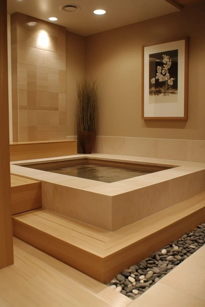 This design combines the simplicity of minimalism with the spiritual tranquility of Zen. The space is designed to promote mindfulness, using natural materials and a soft, earthy color palette. Elements like a pebble shower floor, a simple wooden stool, or a single stem of greenery enhance the Zen feel. The overall layout is open and free of clutter, embodying a philosophy of peace.