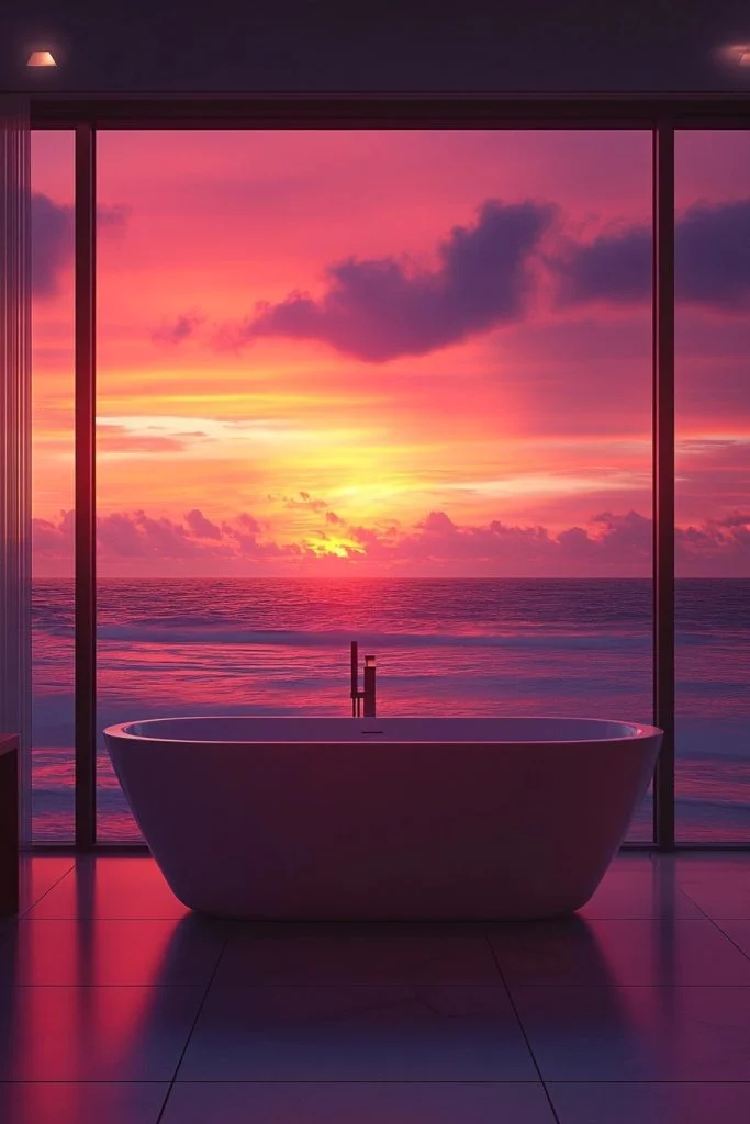 This design is oriented to capture the beauty of the setting sun. Strategic window placement and minimalistic decor enhance the natural light show. The interior colors mimic the hues of the sunset—warm oranges, dusky pinks, and deep purples—often used in a subtle, gradient tile or wall paint. Fixtures are simple and modern, allowing the changing light to be the main decoration.