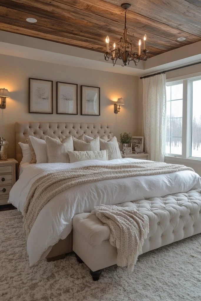 The cozy rustic winter bedroom is all about creating a snug retreat during colder months. Thick, knitted blankets and plush rugs add warmth and comfort, while wood finishes bring the rustic charm. Soft lighting from vintage-style lamps casts a warm glow, ideal for chilly evenings. Incorporating elements like a faux fur throw or heavy curtains can increase the room’s warmth and coziness.